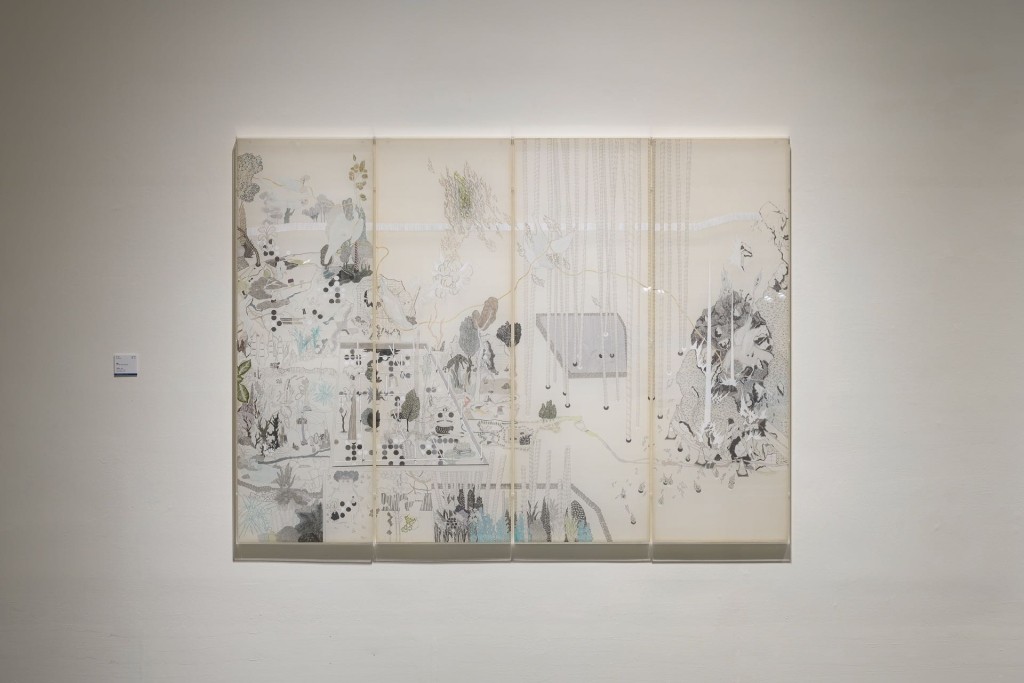 從水墨養成繪畫創作的洪瑄,在此次優選作品《突圍》中,將園林、圍棋與建築工地的場景和空間性,重構過去藝術家所熟稔的水墨技法與符號。藝術家特別選擇了薄透的絹布作為畫面基底,細密經營一個供人遊覽的小世界。白鳥的姿態在四個畫面中產生分鏡感,而廓形之間又有細密的筆法,與漫畫圖像中的效果線等非描寫現實的線條。