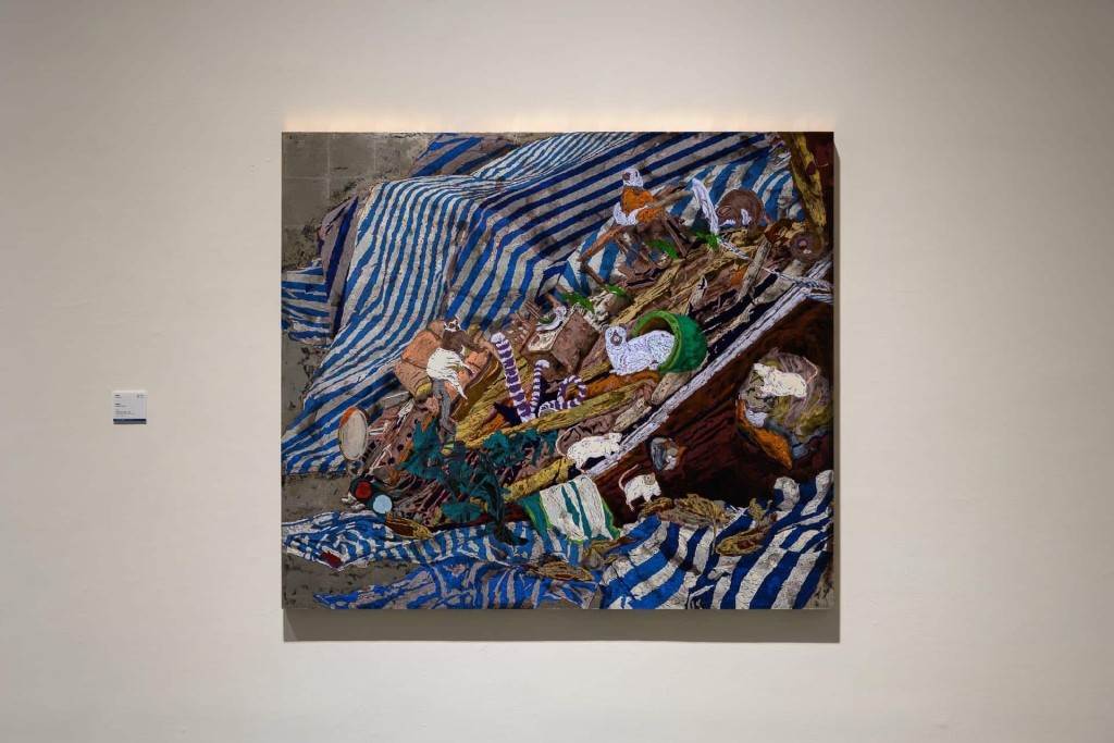 蕭珮宜的作品與論述之間猶如鏡像,呼應著藝術家對當代環境的理解與關照——一個滿是棄物的景象,在藍白塑膠布上堆積、崩塌。除此之外,《寶藏船 II》更令人眼睛為之一亮的,是蕭珮宜在畫面層次做工上的嚴謹與精緻,堆起每一層技法與技術的美感和品味。