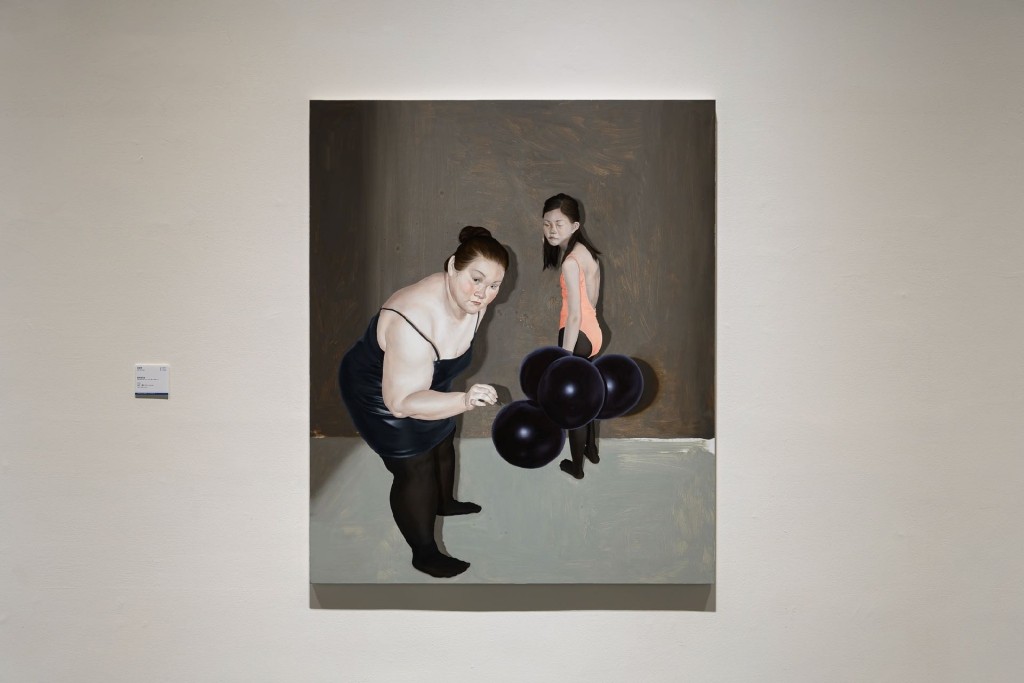 這件作品在簡潔的構圖中,強化了其寫實的情境與張力。在強光照耀之下,左邊的女子望向觀者,右手拿著針,正戳刺著其中一顆黑色球體,像是在試探觀者般。球體在畫面中的存在可以是構圖所需(或許藝術家使用影像編輯軟體製作草稿有關),亦是某種繪畫性的存在。畫面的寫實表現作為表象,其重點在於藝術家如何藉其方法,將意識形態導入繪畫表現之中,而不淪為意識形態文本的配圖、又或者是在寫實繪畫風格中表現師承,並掌握創作美學上的轉化。