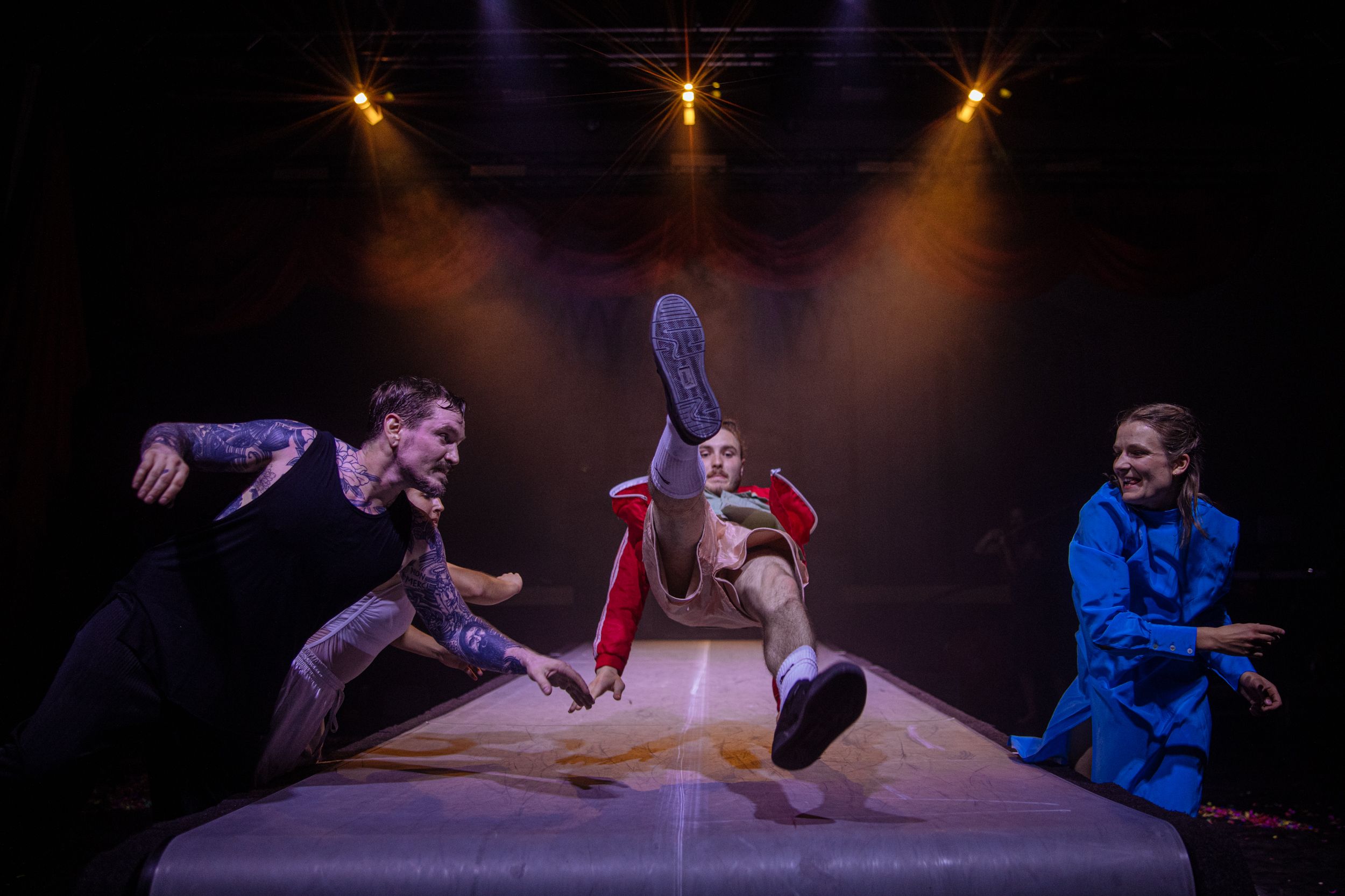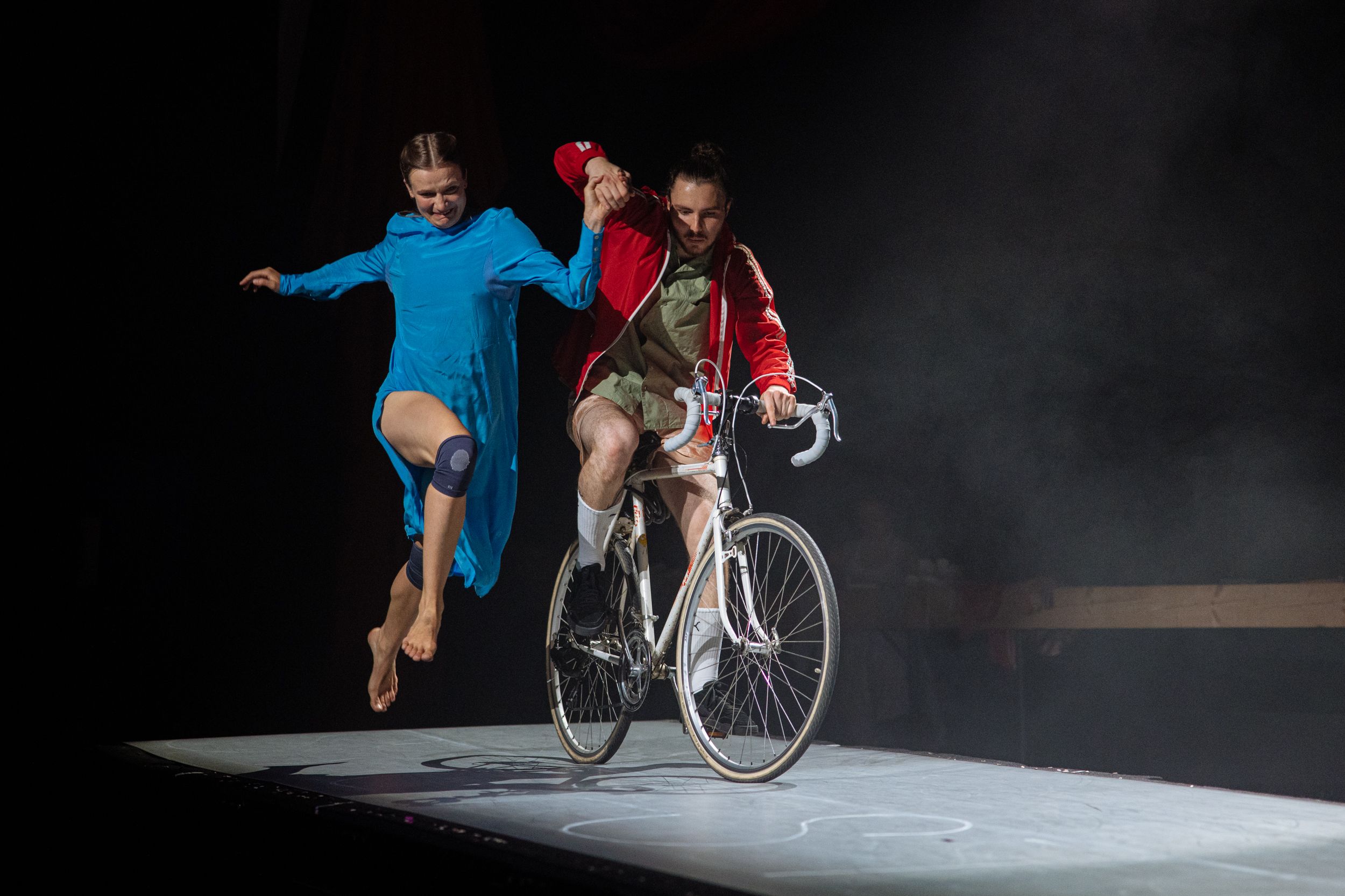 《奔跑者》將分秒必爭的日常搬上一座十公尺長的巨型跑步機,打造一場融合舞蹈、馬戲、雜耍與現場音樂的詩性奔馳。又寬又長的輸送帶宛如永無止境的時間軸線,忽快忽慢,從不停歇。四位表演者在輸送帶上追逐、舞蹈、雜耍,甚至騎著腳踏車,對抗不斷加速的節奏;兩位音樂家現場演奏提琴、鍵盤和吉他,時而強烈,時而低迴,勾勒生活的重複與混亂。