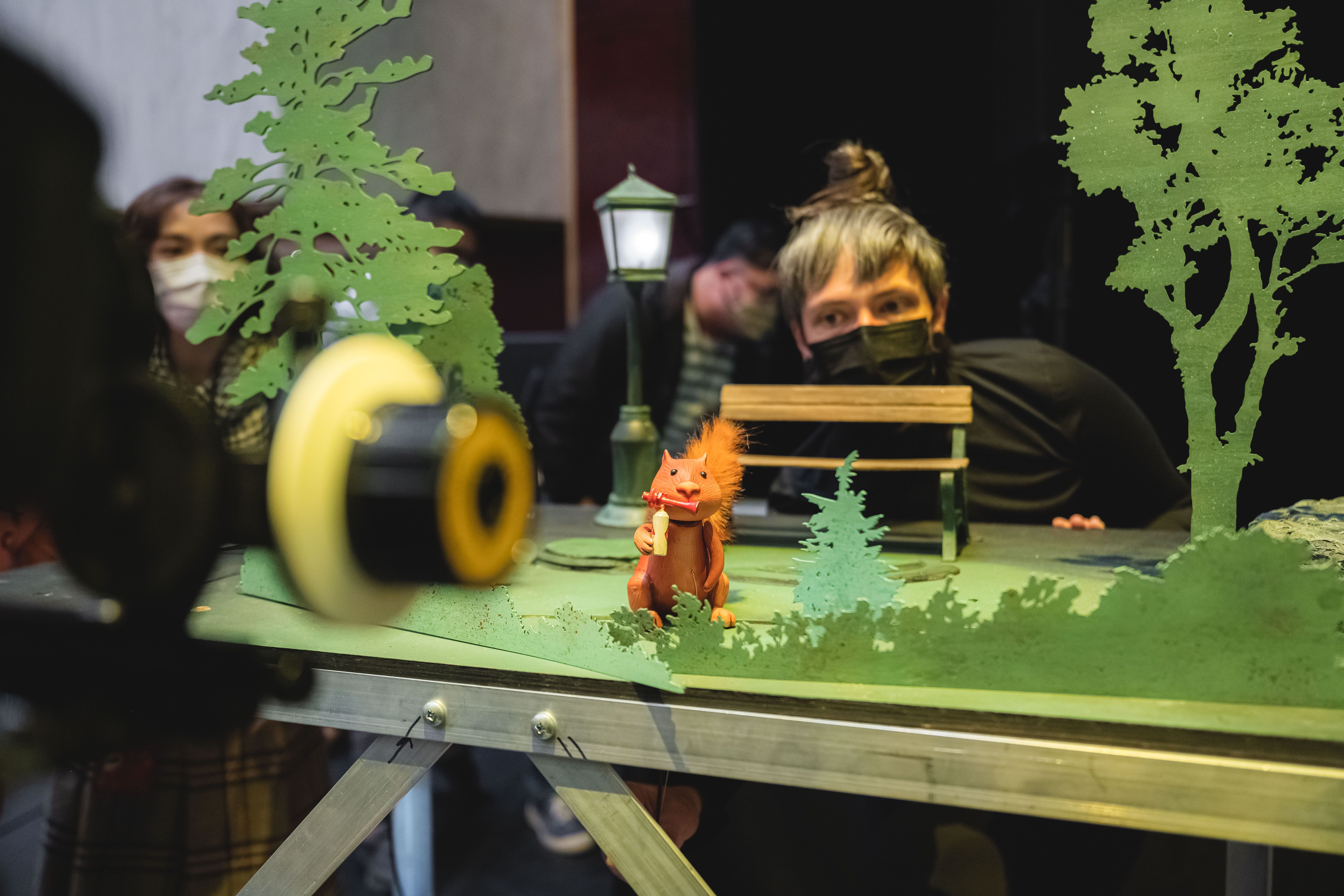 舞台其實就是拍片現場,操偶師們要操作 75 隻戲偶,音樂和音效都是由三位弦樂老師和無尾熊小子 LIVE 演出,並架設 8 台攝影機穿梭在 20 座微型佈景之間,即時切換畫面投影到上方的大螢幕,直接上映一齣「完整的電影」,完全不能 NG 也無法重來的「一鏡到底」手法,舞台既是幕前也是幕後,堪稱一氣呵成。