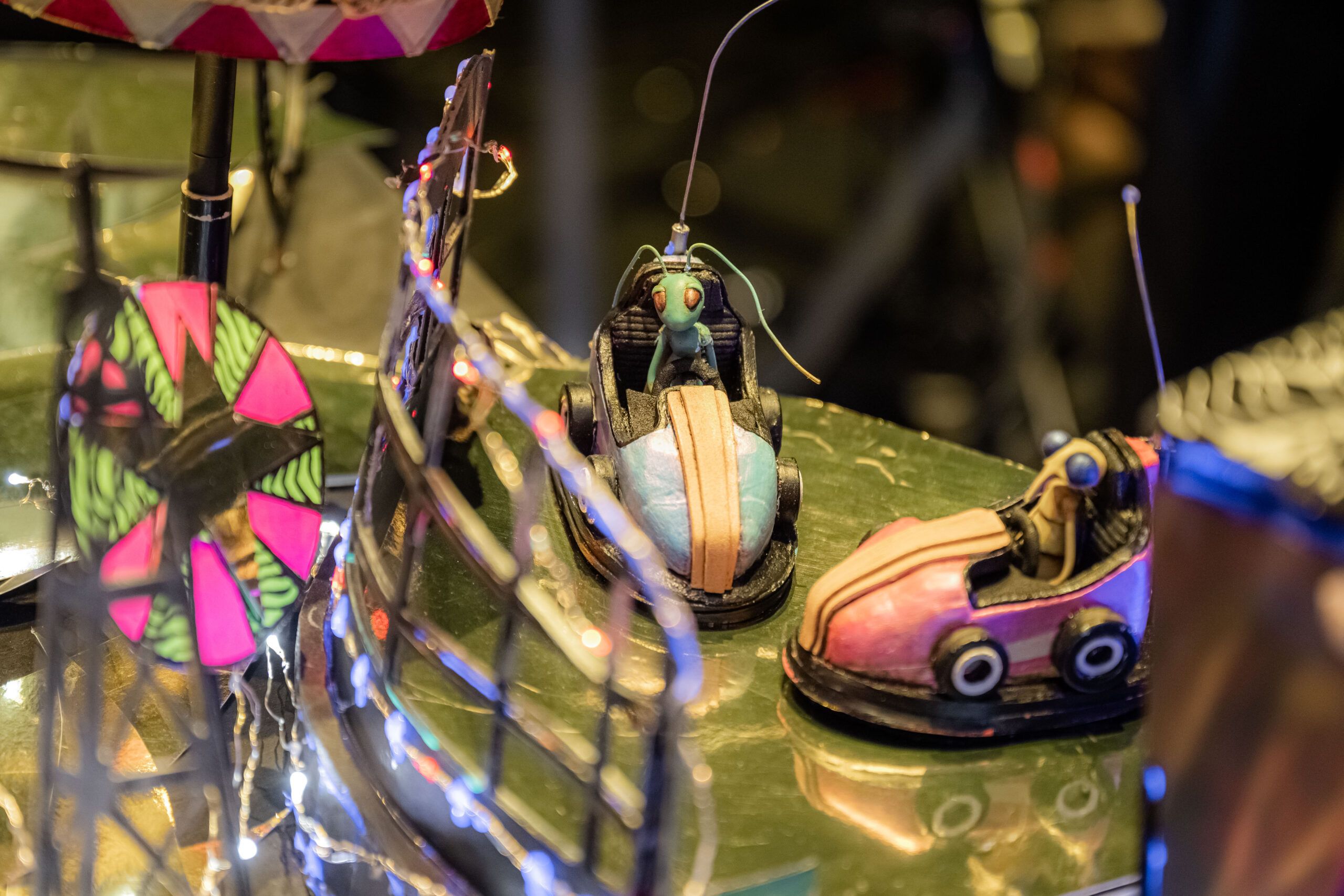 電影中的單一場景,其實可能是同時拍攝好幾個區塊組成,並使用大小尺寸不同的戲偶與道具:像是蚊子和螽斯一起喝飲料的畫面,需要餐廳遠景並使用手掌大的全身偶,近景則使用幾乎與人等大的半身偶,甚至有俯視角度,由操偶師穿上對應顏色的手套,用前臂和手掌模擬餐桌上的情境,當然,所有的菜單、杯子和吸管等等,都有放大版和迷你版;畫面必須在三方攝影區塊中迅速切換,執行時間抓得精準無誤,還要搭配音樂,堆疊各種和緩急促的戲劇張力,真的是非常不簡單!