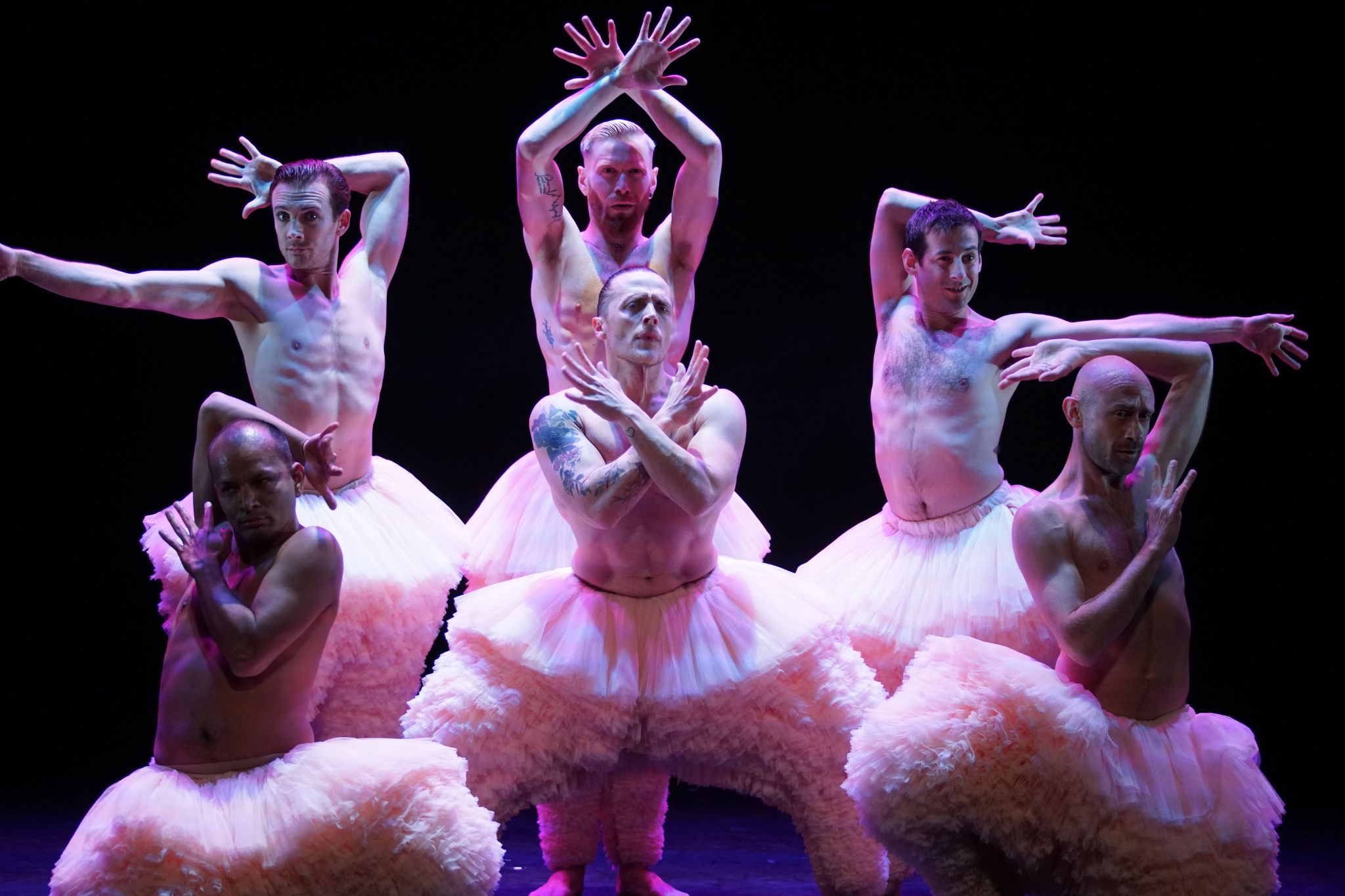 《蓬蓬》就像是舞蹈的Uber Eats,知名的舞蹈橋段都點的到。對於不熟悉舞蹈的觀眾,看完了《蓬蓬》就像一口氣用Uber Eats點了各地餐廳的名菜—天鵝湖、春之祭等等一應俱全。創意十足的編舞者菲利普‧拉斐耶當然不會作業照抄,他把舞蹈的名作用自己流暢的筆法重寫一次。舉例而言,芭蕾舞劇《天鵝湖》中有家喻戶曉的段落〈四小天鵝〉,四名舞者手牽著手,以整齊劃一的姿態來詮釋天鵝的纖細優美。芭蕾的技巧講究平衡,而平衡是一個差一毫釐則失之千里的事情,一旦全身的重量放在足尖上,哪怕只是一口氣換得不對,都有可能砸了表現,更何況是四個人手牽手。如果沒有跳舞經驗的人,不妨想像園遊會的兩人三腳遊戲,四人手牽手的《四小天鵝》就像是兩人三腳遊戲,難度乘以百倍。經典的四小天鵝的看點在於整齊劃一,而《蓬蓬》中的四小天鵝橋段則讓四名舞者穿上白鳥裝(雖然我知道這應該是天鵝裝,但那胖胖的外型根本是大白鴨),四個人盡情扭動羽毛屁股,鳥形鳥狀的姿態,堪稱Discovery版的天鵝湖。