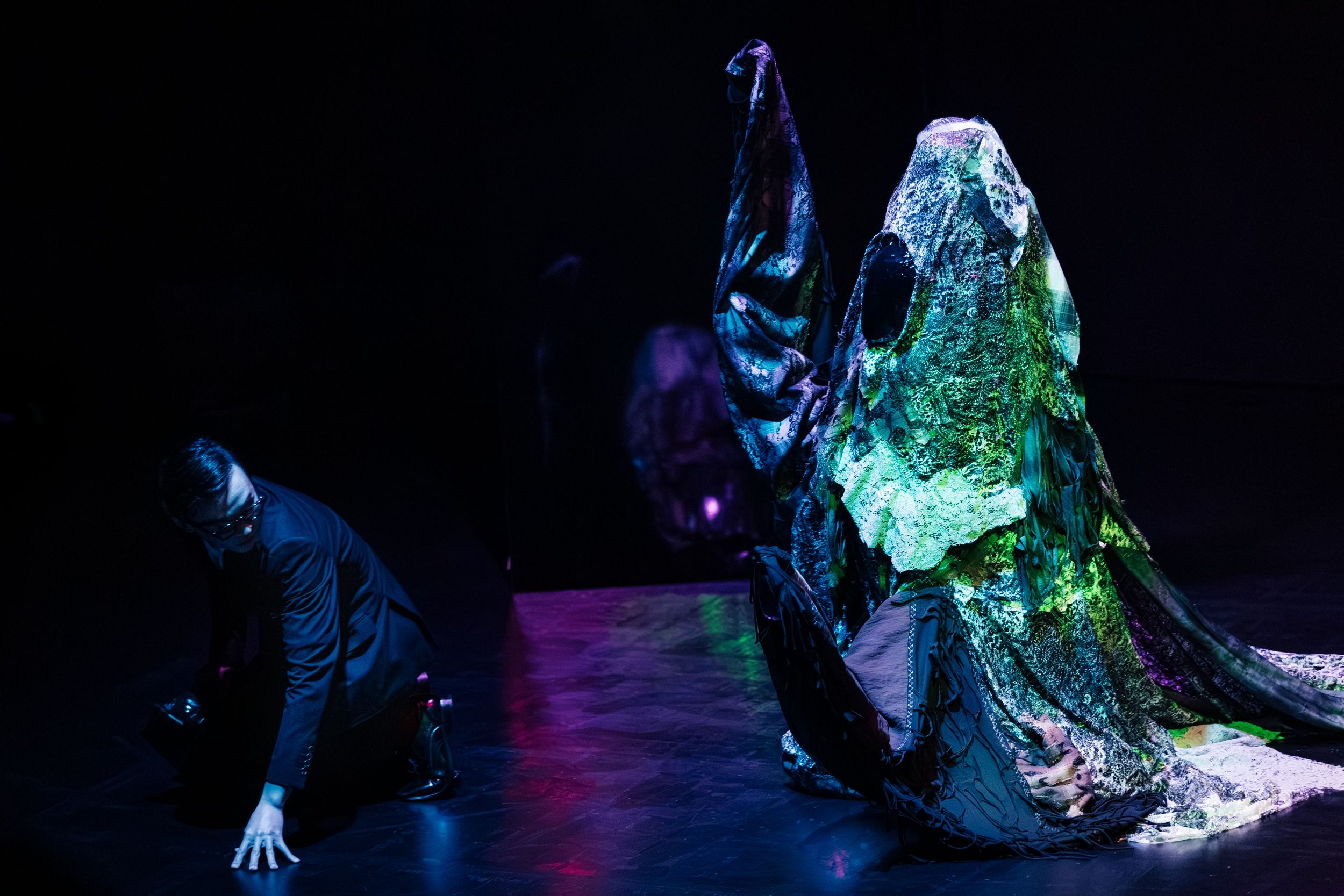 這或許正是鬼魂與記憶、口傳歷史的相似之處。它們皆是曾經存在之具體事物遺留下來的無形幻影,雖能隨時受召喚,卻喪失主動權,必須附身他者才能顯現世人眼前。於是,《K與龐蒂的神祕降靈》試圖在歌謠、扮演、多重文本之外,試圖用「影像」開啟這場降靈。劇中讓影像在空間中自由來去,不受實體投影幕限制位置,更以強烈燈光為基底介質,將影像投射於光中,呈現浮空投影般的效果,[1]讓無形物(影像)藉另一無形物(光)現身,實現劇場幻術。至於昏暗燈光透過鏡面反射的虛實幻境,則像是藉此反思「我們」與「鬼魂」之間關係,抑或鬼魂如何反向召喚我們的內在自我。