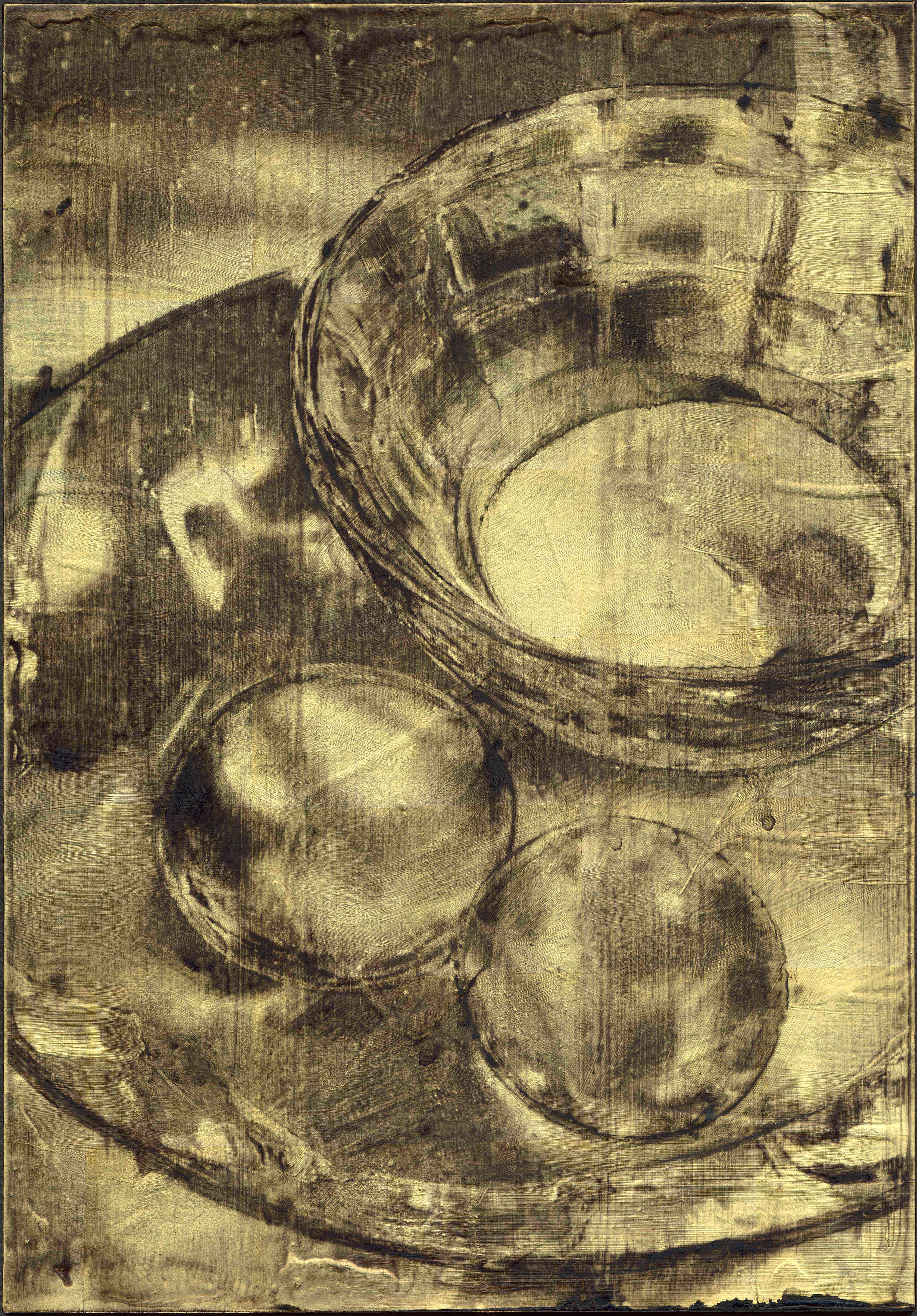 後來在東海接觸水墨,我把膠彩、箔帶入創作中,再把影像複印在箔上後,發現影像在箔上面是很脆弱的,在刷染的過程中影像會慢慢變得模糊,而膠和墨則會順應這個過程產生其他的樣態。因此,作品中強烈的影像性,跟之前的學習經驗有很大的關係。