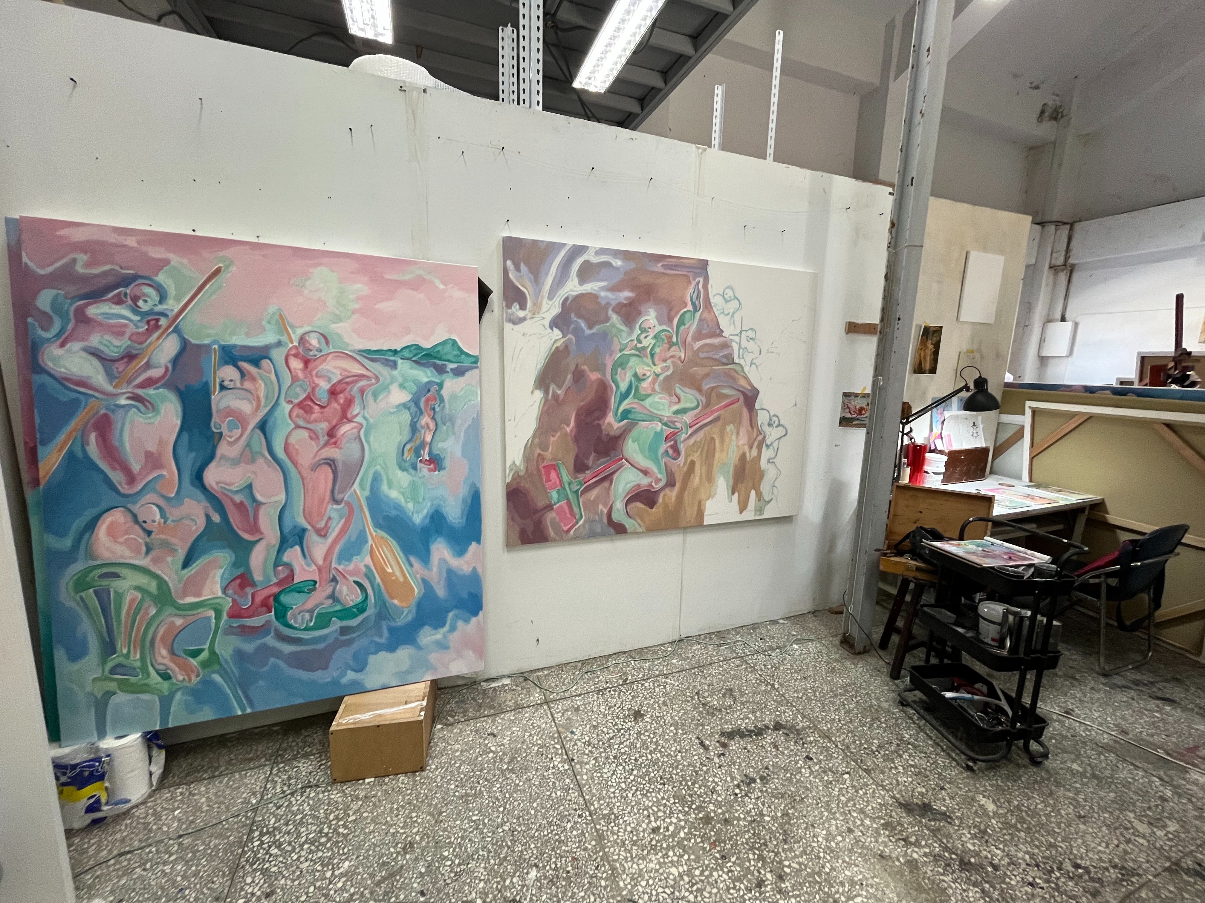 我的畫室老師楊雅蘭也影響我很深,覺得她是一個很酷的藝術家,她把整個生活當作一個創作,因為很喜歡藍色她就什麼都買藍色,整間畫室從牆壁到櫃子都是她的作品,所有物品都被他畫過,而且過一陣子就會改。印象深刻的是,她會一直跟我們說「要畫滿,留白要有用」不要扭捏地放在角落,要張揚一點,現在回頭看,就會覺得這些經歷跟之後我的創作有種關聯。