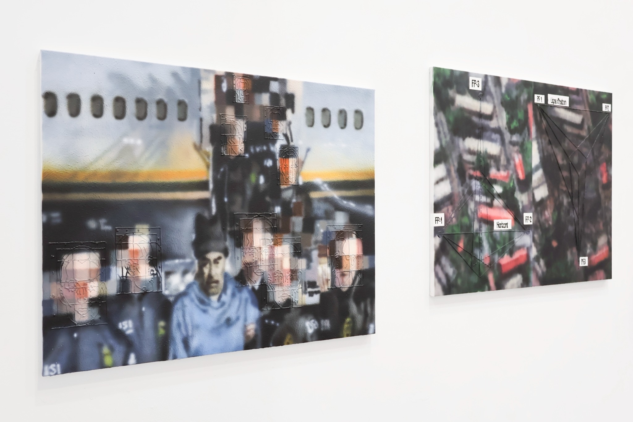 最近的作品從國際政治事件(川普下令襲擊委內瑞拉並逮捕委國總統馬杜洛)出發,並將影像在畫面中的安排更為純粹,更聚焦於單一的活動發生。同樣是挪用社群媒體中的新聞影像、戰爭空拍與民眾的實拍現場紀錄,透過截取與重組,將原本快速流動的數位影像轉化為繪畫中的新視覺場景。畫面刻意疊合透視、光源與人物比例等標準化教學圖像,使事件被拆解與分析,呈現如教材般的結構。影像與繪畫公式的交錯,不僅揭示媒體敘事中的權力與暴力關係,也引導觀者反思自身的觀看習慣,質疑我們究竟是在理解事件本身,還是在既有框架中被訓練如何觀看。