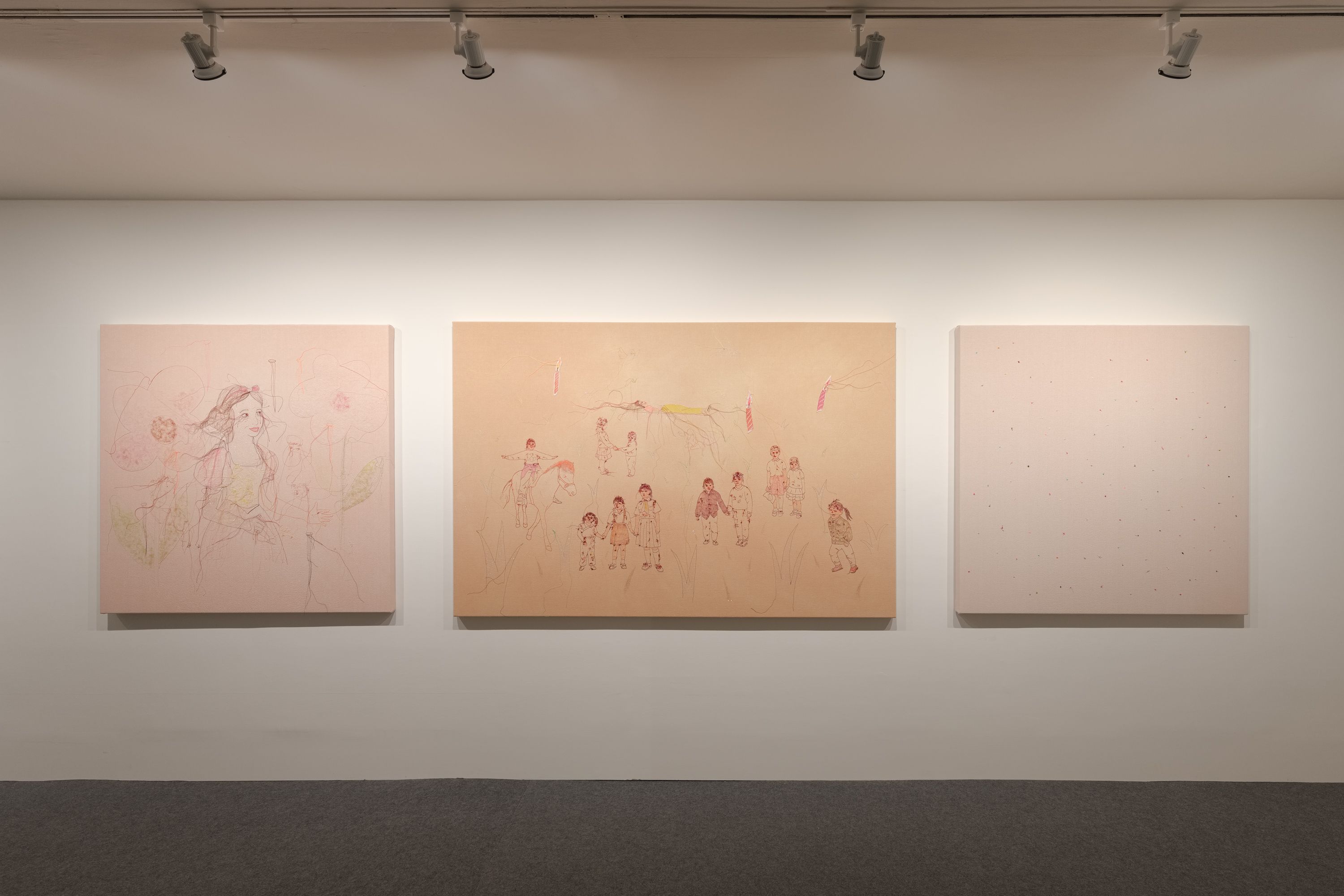 在縫繡補綴的童話故事中,猛烈的針刺入畫面,留下隨意飄盪的線團,象徵美麗與暴力的衝突並存。系列作品呈現:童話公主的破壞與縫補、生存中面對內外的戰爭、隱藏彈孔暗喻的危機;在柔軟素材中暗藏危險與尖銳,映照希望、暴力與對抗。