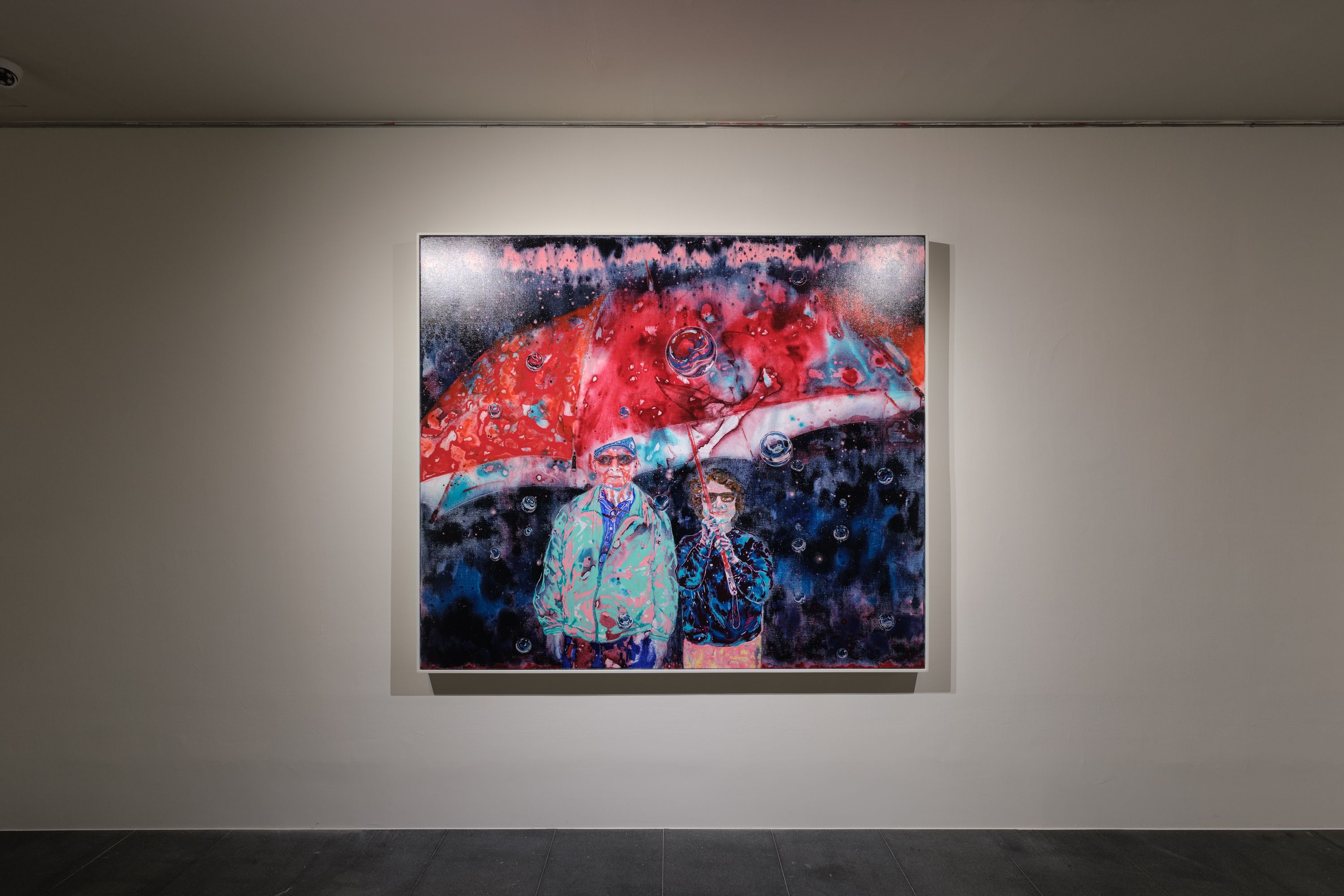 畫面中父親依戀著母親的保護傘,觀者作為子女與父母互相注視著,彼此既是客體、亦為主體,展現繪畫的矛盾與邊界。刻意被放大的保護傘則是家人之間糾結與無法言喻的感情,它巨大、包容卻也充滿壓力,既是依靠也是牢籠。