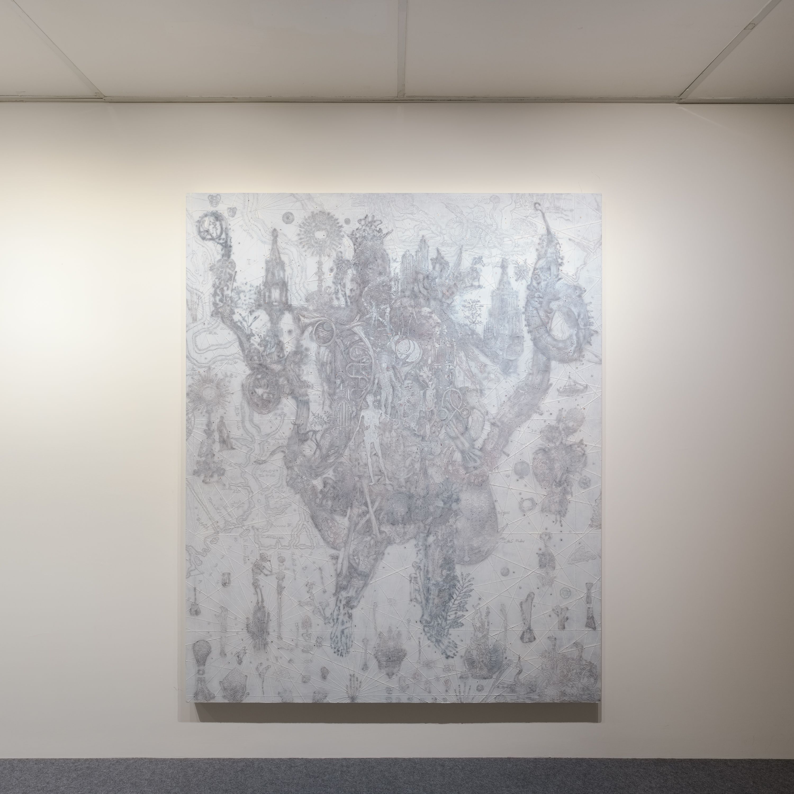 藝術家長期以地圖、星座作為繪畫創作素材,此作品拼貼網路「以圖搜圖」後呈現的影像,再運用近似古典蛋彩畫的堆高技法,在單色背景上刮除、打磨、拓印、拼貼,使畫面呈現近似地圖或星座圖的肌理,真實呈現材料質感,詮釋對繪畫與時代面貌的觀察,並留給觀者開放解讀空間。