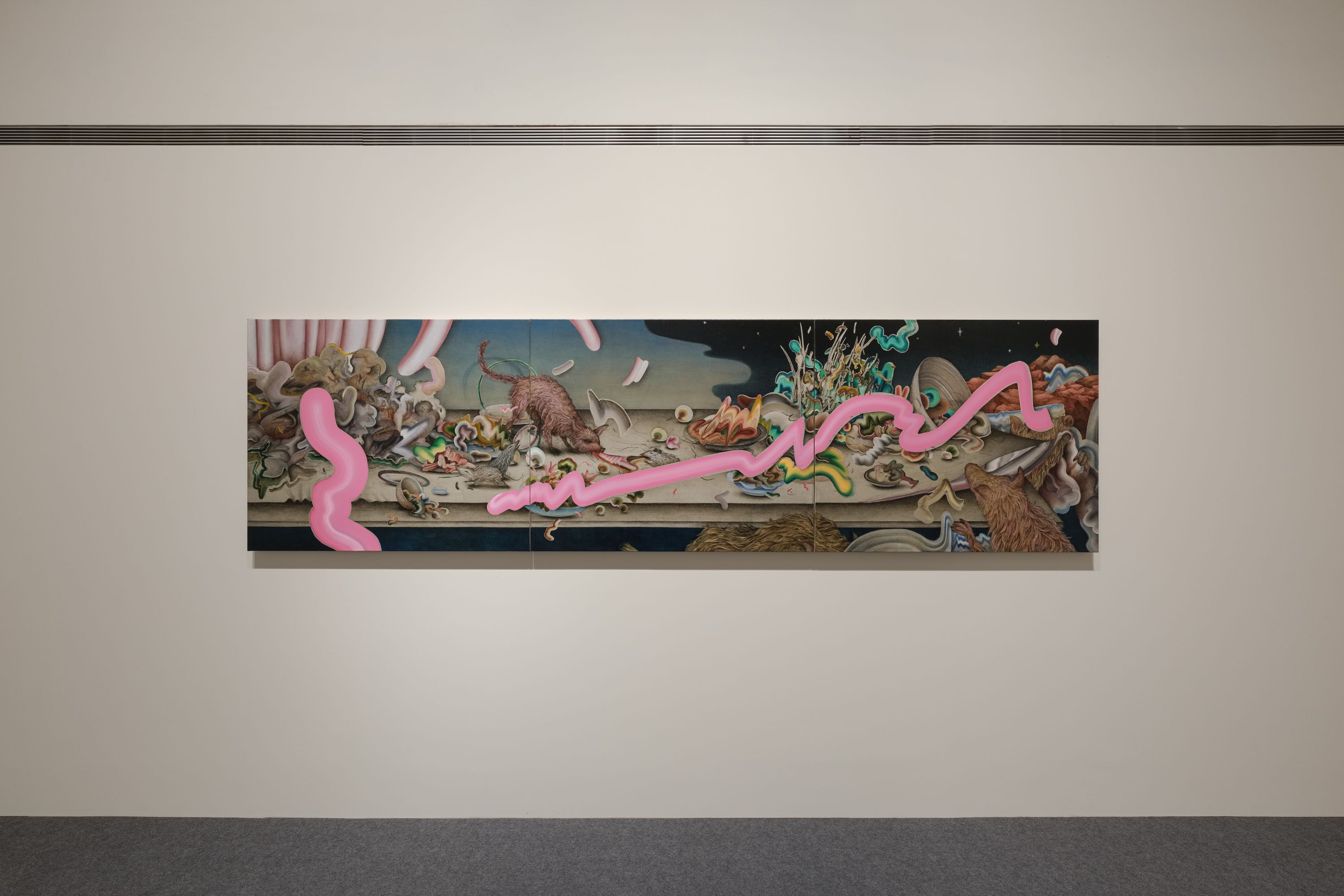 作品描述一群象徵慾望的野獸掠奪餐桌食物的場景,與其說是破壞,更像描繪一種對既定事務或文化的抵抗,過程中又孕育出新的慾望;華麗而混亂的饗宴,詮釋內心的貪婪與黑暗面,以奇特荒誕的場景引領觀者開啟想像。