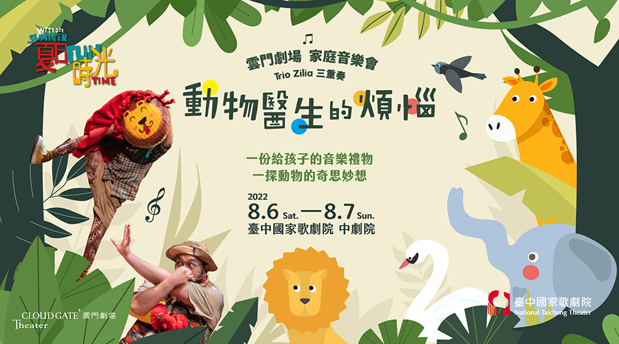 由小提琴家李宜錦、大提琴家連亦先及鋼琴家王佩瑤組成Trio Zilia三重奏策劃的《動物醫生的煩惱》,改編自法國作曲家聖桑知名組曲《動物狂歡節》,透過絃樂、鋼琴、打擊樂等生動樂音描繪獅子吼叫、大象沉重步伐及烏龜緩慢匍匐前進等聲音,同時以動物行走的姿態、步伐節奏引導孩童感受音樂速度的變化。導演暨編舞家王宇光亦將帶領雲門舞集舞蹈教室小舞者,加入這場結合音樂、舞蹈、戲劇、互動遊戲的奇幻冒險,一起完成動物醫生的任務,解決動物們的身心困擾!