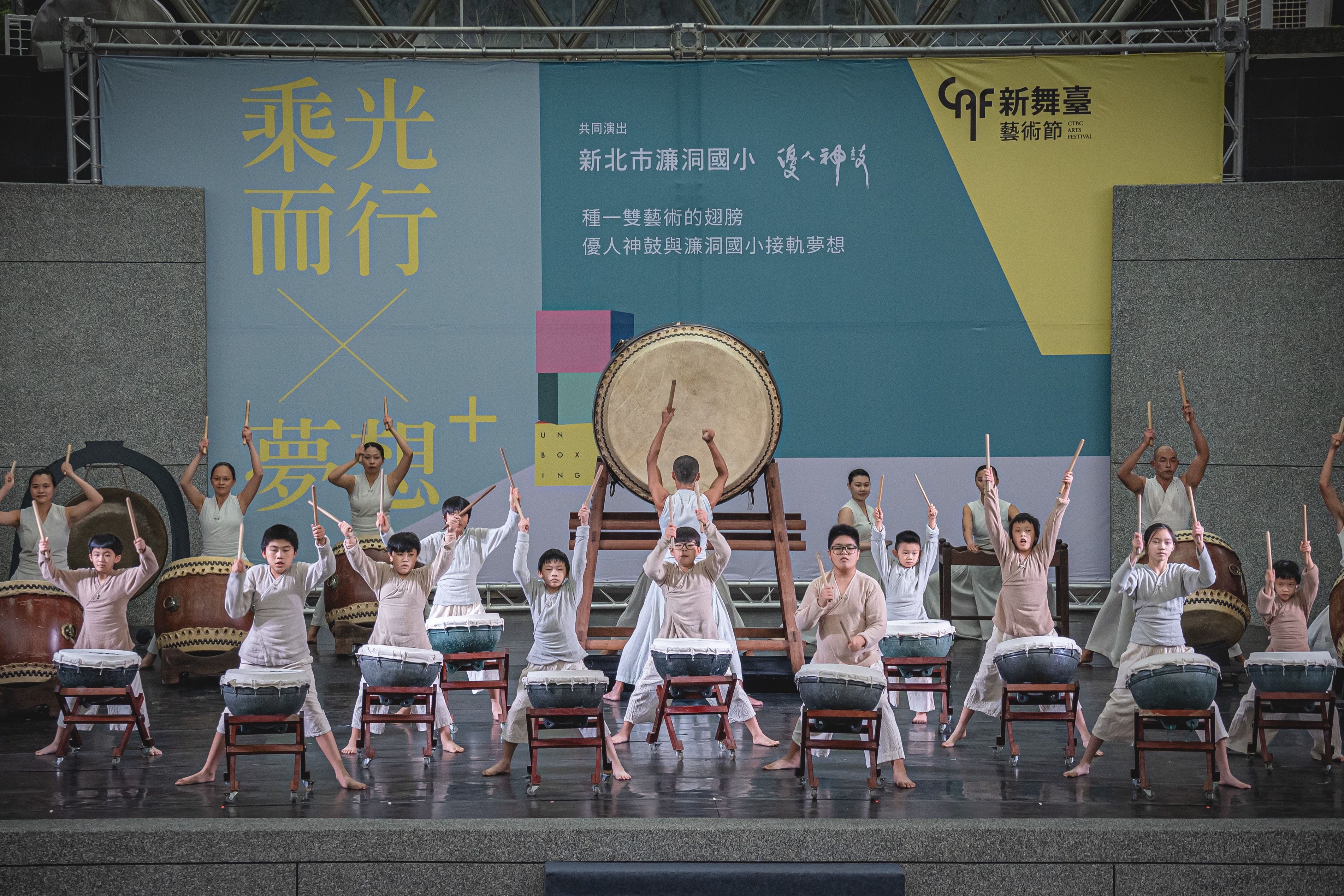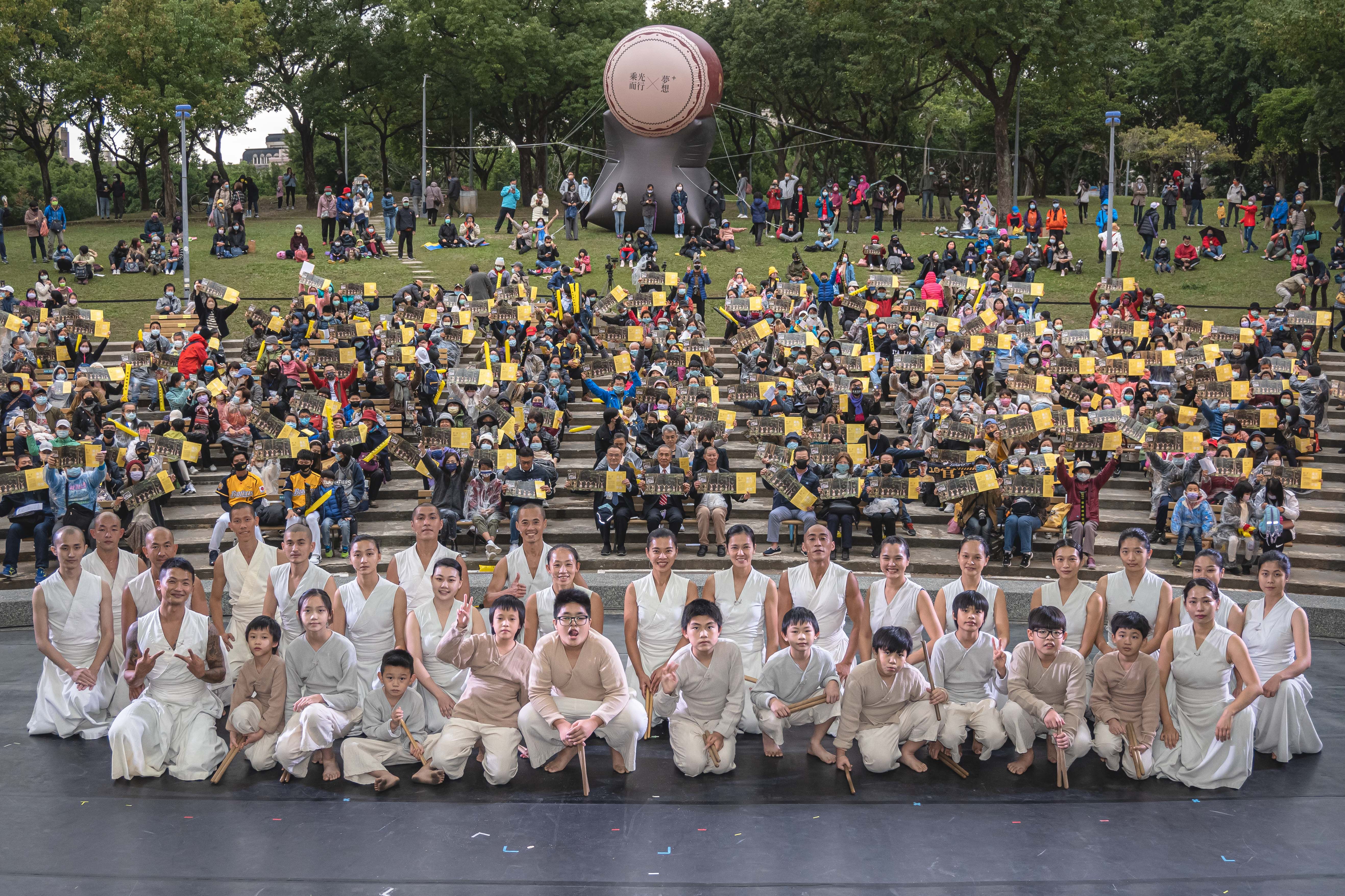 中國信託文教基金會舉辦的2021新舞臺藝術節公益場「乘光而行 x 夢想+」今下午於大安森林公園露天音樂台登場,由優人神鼓帶領新北市濂洞國小的11名孩子們擊鼓共演,傳遞來自瑞芳山城的震撼鼓音。11名學童的認真神情與動作博得滿堂彩,台下近千名觀眾報以熱烈掌聲,安可聲四起。