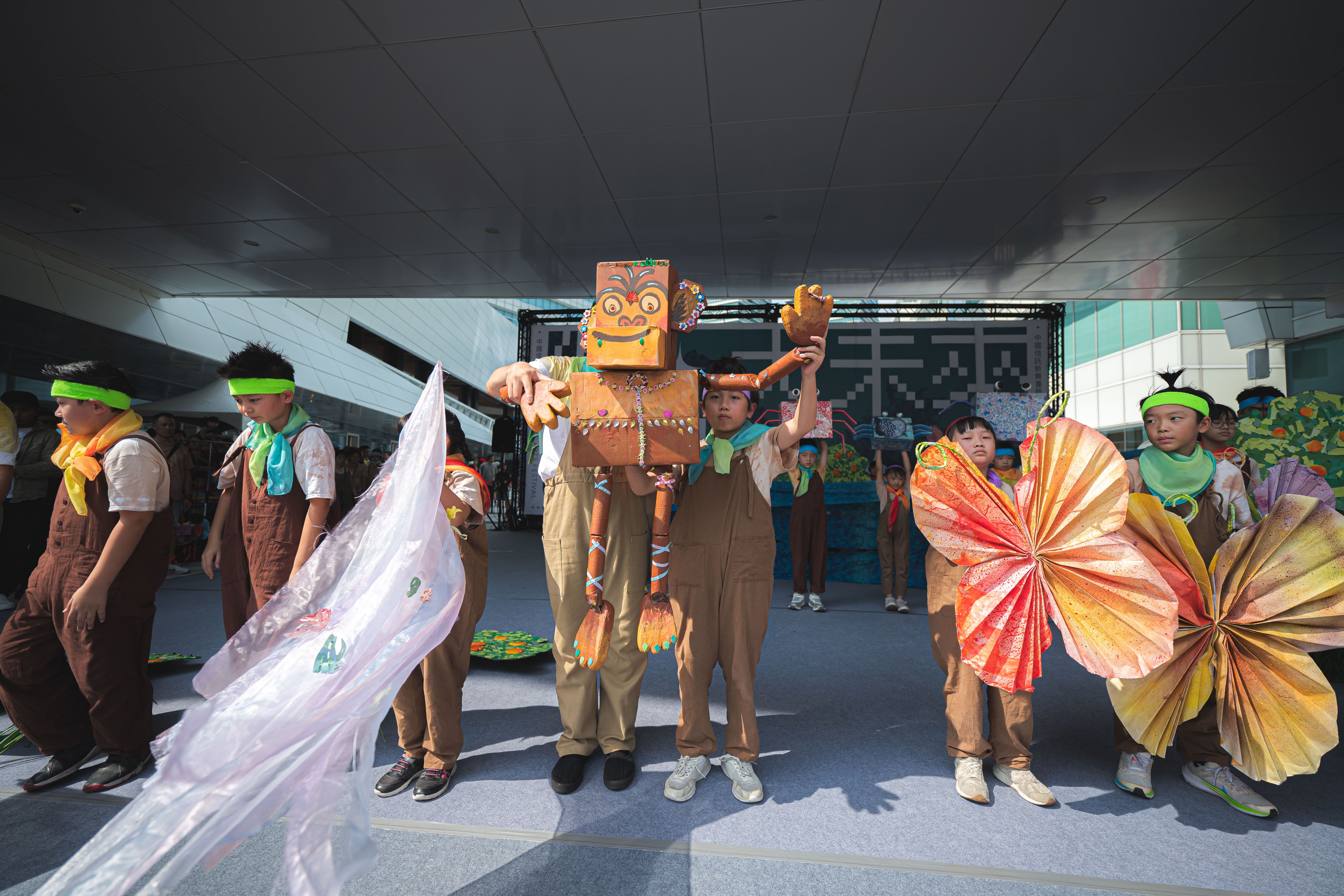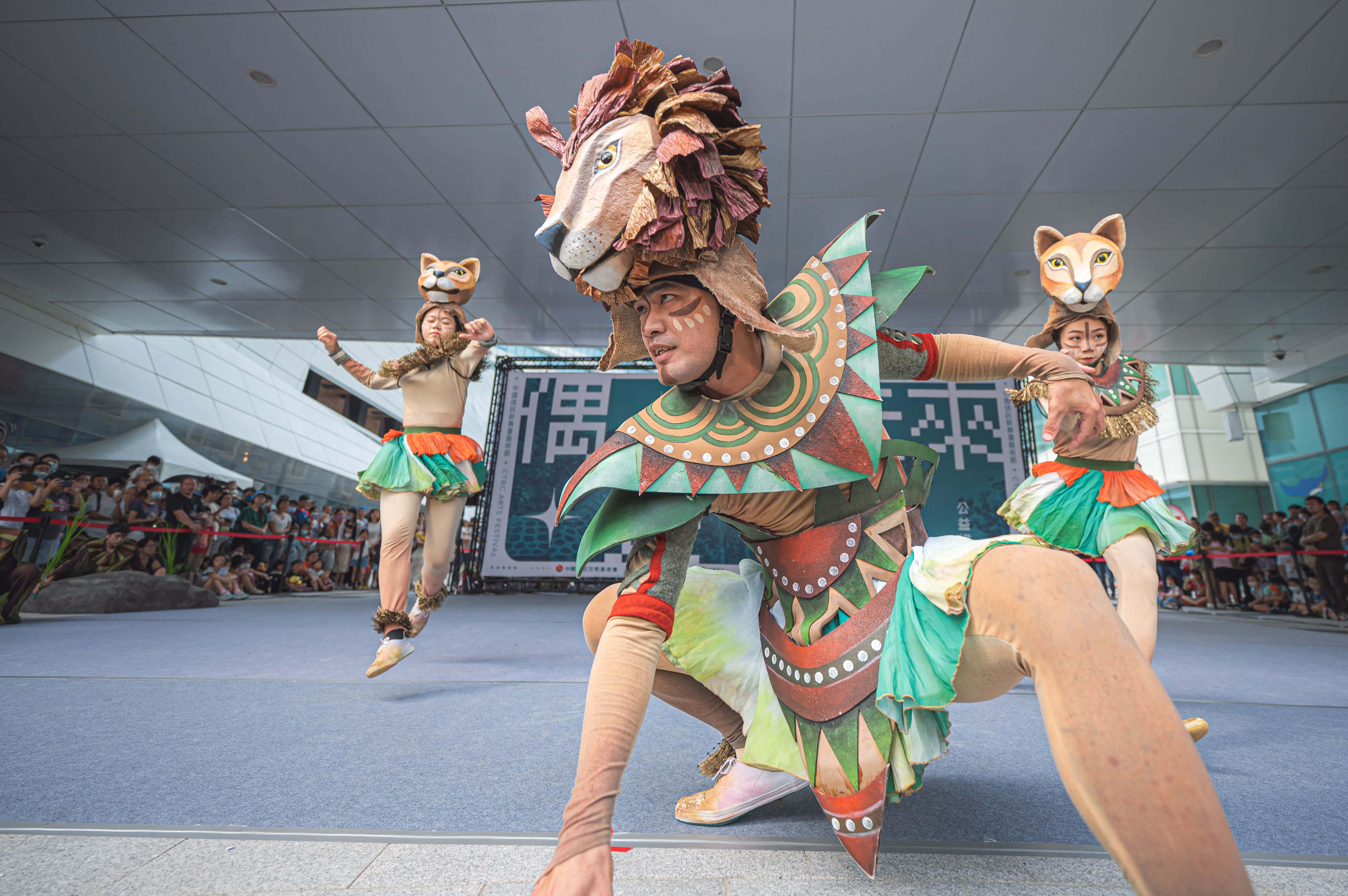 除了化育分校小朋友的暖心演出,無獨有偶工作室劇團人氣作品《飛躍世紀》猶如當代偶戲版的「馬達加斯加」,1:1仿真野生動物大集合,讓全場觀眾置身非洲大草原。兇猛的獅子撲到眼前,小朋友驚聲尖叫,反射性跳起來逃命:活潑的長腿紅鶴想要握握手,害羞的孩子指縫偷看,又愛又怕受傷害;河馬寶寶穿上圍兜兜,眼尖的小朋友立刻發現「河馬寶寶換裝了耶」,專業的偶戲藝術家以細膩靈活的舞蹈,展現非洲草原的狂野奔放,更讓觀眾有機會與偶零距離互動。不只主舞臺有精彩表演,臺、泰藝術家14檔偶戲在三重世貿公園接力「開張」:小丑占卜師鐵板神算,為眾生解決生活煩惱;藝術家郭品辰的「大便專賣店」主題鮮明逗趣,逗得小朋友捏鼻嘻笑又忍不住探頭探腦;藝術家余孟儒的獨角戲《袋鼠媽媽還沒崩潰》成功圈粉媽媽族群,與袋鼠媽媽「抱團取暖」;泰國藝術家Jae擅長光影、插畫,在枝葉扶疏的木棧道「說書」,整個午後偶戲處處現蹤,舞台無所不在。除了精彩偶戲,中國信託商業銀行、台灣人壽、台灣彩券、中國信託慈善基金會以及台灣運彩公益大集結,許多單位設計闖關任務,吸引民眾大排場龍挑戰,很多民眾大包小包戰利品,直呼「好有成就感」。
