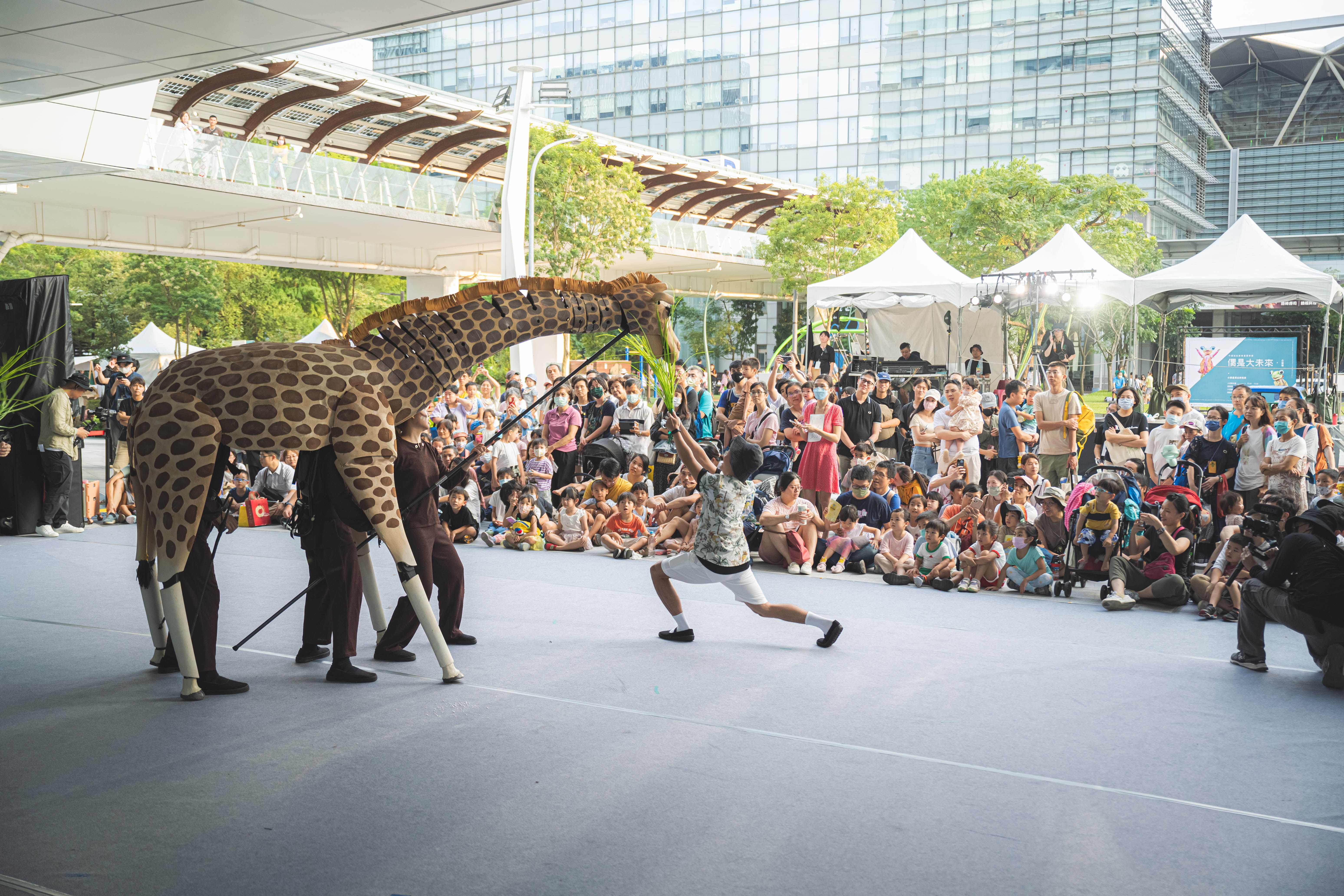四米高的長頸鹿是最有人氣的大隊長,帶著紅鶴、羚羊從中國信託金融園區漫步到三重世貿公園,吸引近兩千名大朋友、小朋友緊緊跟隨,動物大遷徙浩浩蕩蕩,場面壯觀又充滿童趣;另一頭,河馬搖擺著巨大的身軀,從茂密的蕨草叢林倏忽現身,又引來陣陣驚呼!中國信託新舞臺藝術節公益場《偶是大未來》9/16(六)熱鬧登場,中國信託金融園區和三重世貿公園搖身一變,成為沉浸式戶外劇場,「大偶快閃」、「故事屋劇場」、「獨角偶戲」等十多檔精彩偶戲不斷電演出,讓民眾不畏烈陽與「偶」同樂,體驗當代偶戲的無限魅力!
