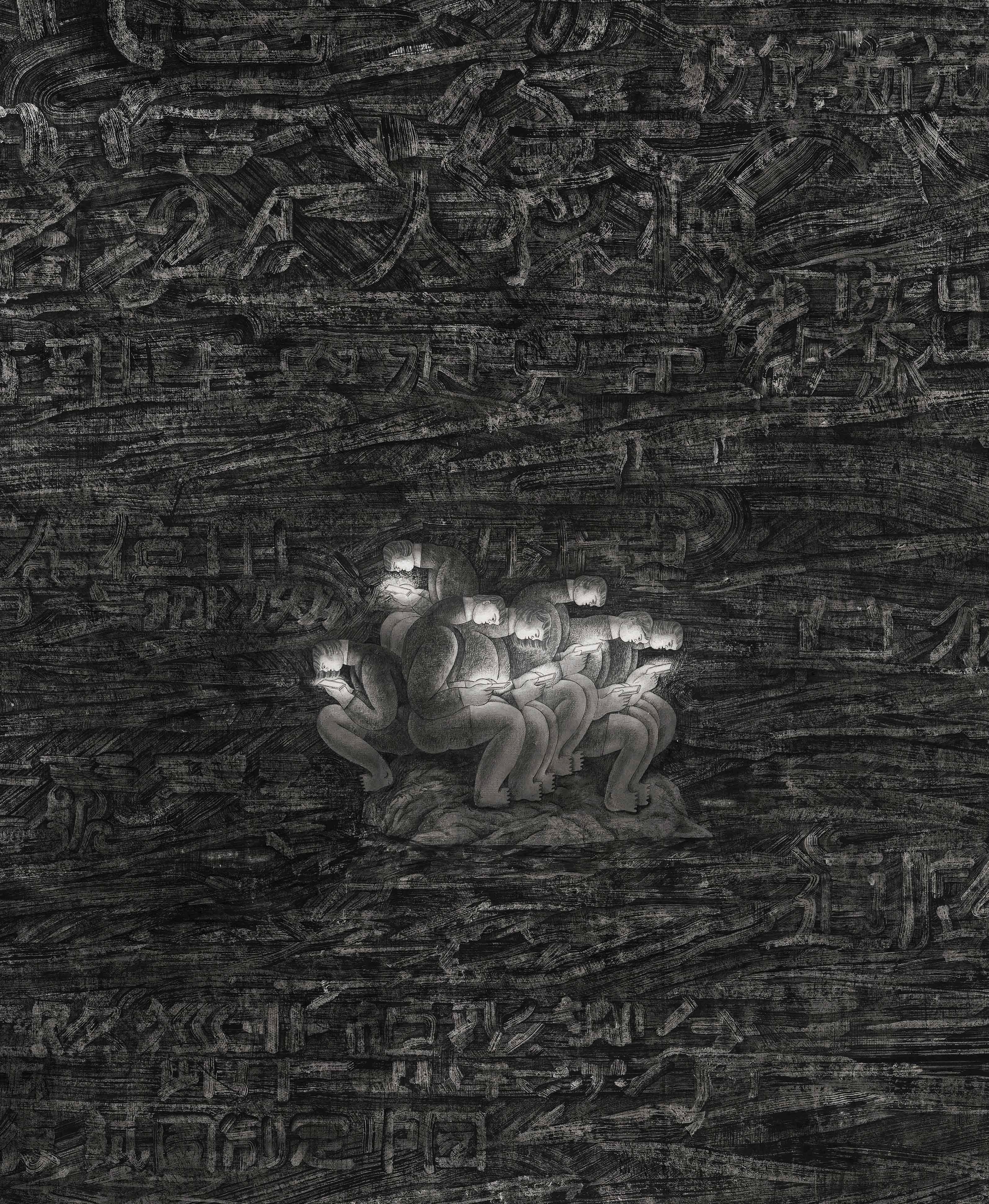 In Fragmented Yesterday-2, the painting depicts indistinguishable characters filling the scene, with individuals standing alone on a rocky island in an ink sea. They seem close, yet are absorbed in their phones. Modern loneliness is found here—each person is solely focused on what matters to them. Immersed in a silent sense of chaos, they gradually lose their sense of direction and belonging.