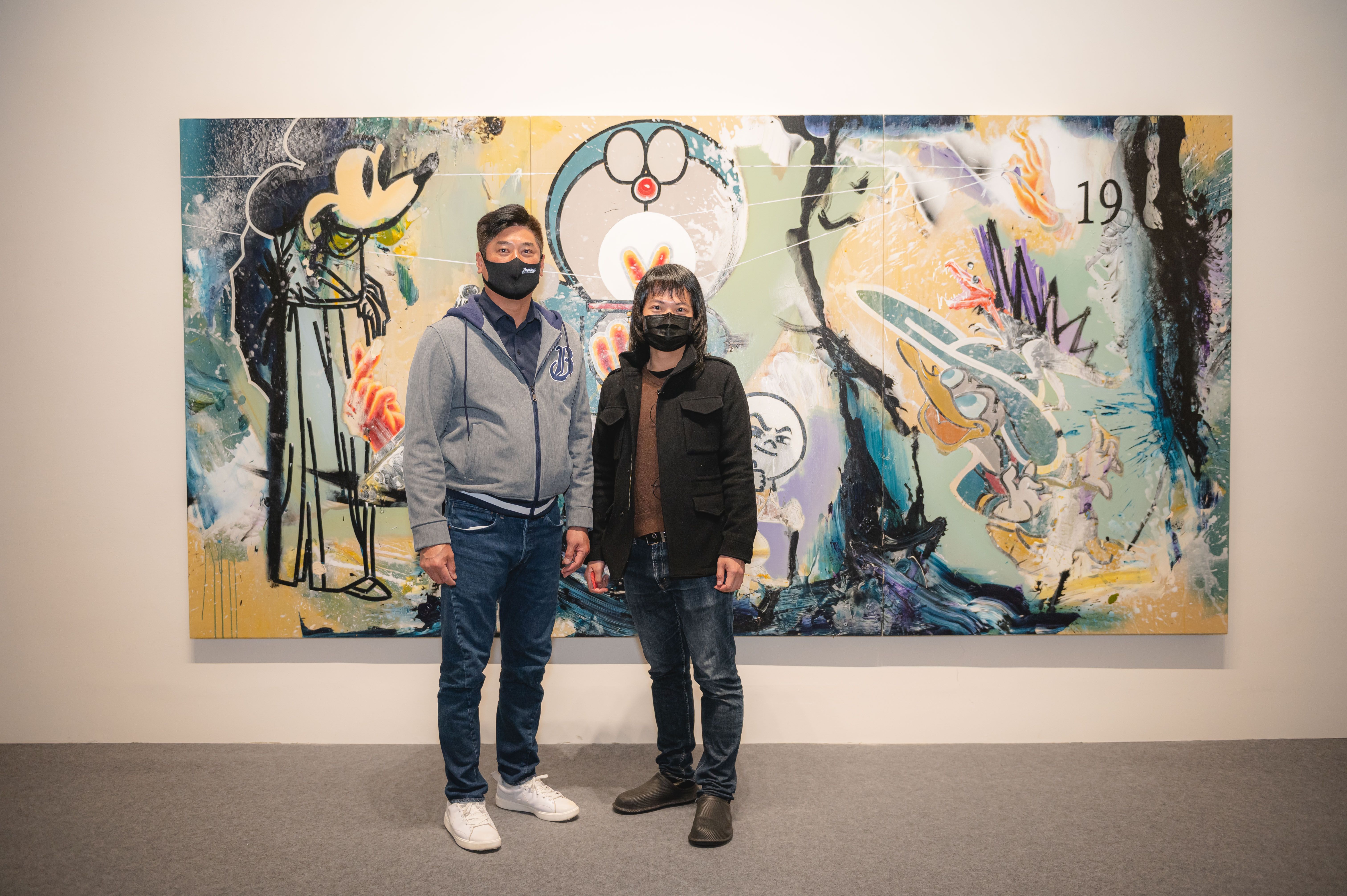 首獎作品《美好時光之無煙硝NO.19戰役》是展場最巨幅的作品之一,蔡宜儒有感新冠疫情,以兒時回憶的卡通、電玩人物作為畫中角色,「以昨日角色演述今日故事」一頭長髮的他,看似奔放不羈,個性卻隨和謙遜,面對川流不息的貴賓,深入淺出闡述作品理念,被問起「放榜」那一刻,坦言驚喜又驚訝:「參賽者卡司太強,我重新刷螢幕刷了好幾遍」,蔡宜儒感嘆繪畫的「話語權」,常在其他強調跨領域的評比機制中被稀釋了,所以一看到「當代繪畫獎」就躍躍欲試,「當代繪畫表面上有暢所欲言的空間,但仍要有足夠的美學涵養,以免流於花拳繡腿,而與時俱進的挑戰,也特別迷人;從事這一行,家人朋友常問我看得到未來嗎?回歸內心,我就是想透過繪畫,講我想說的話。」