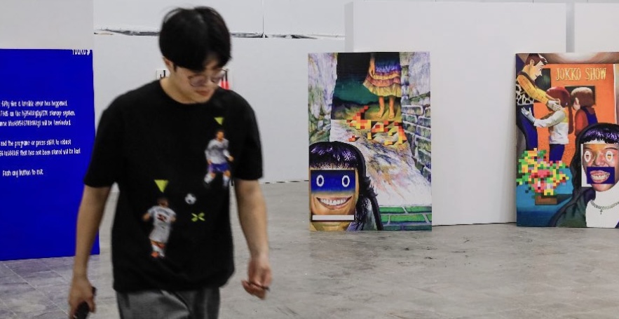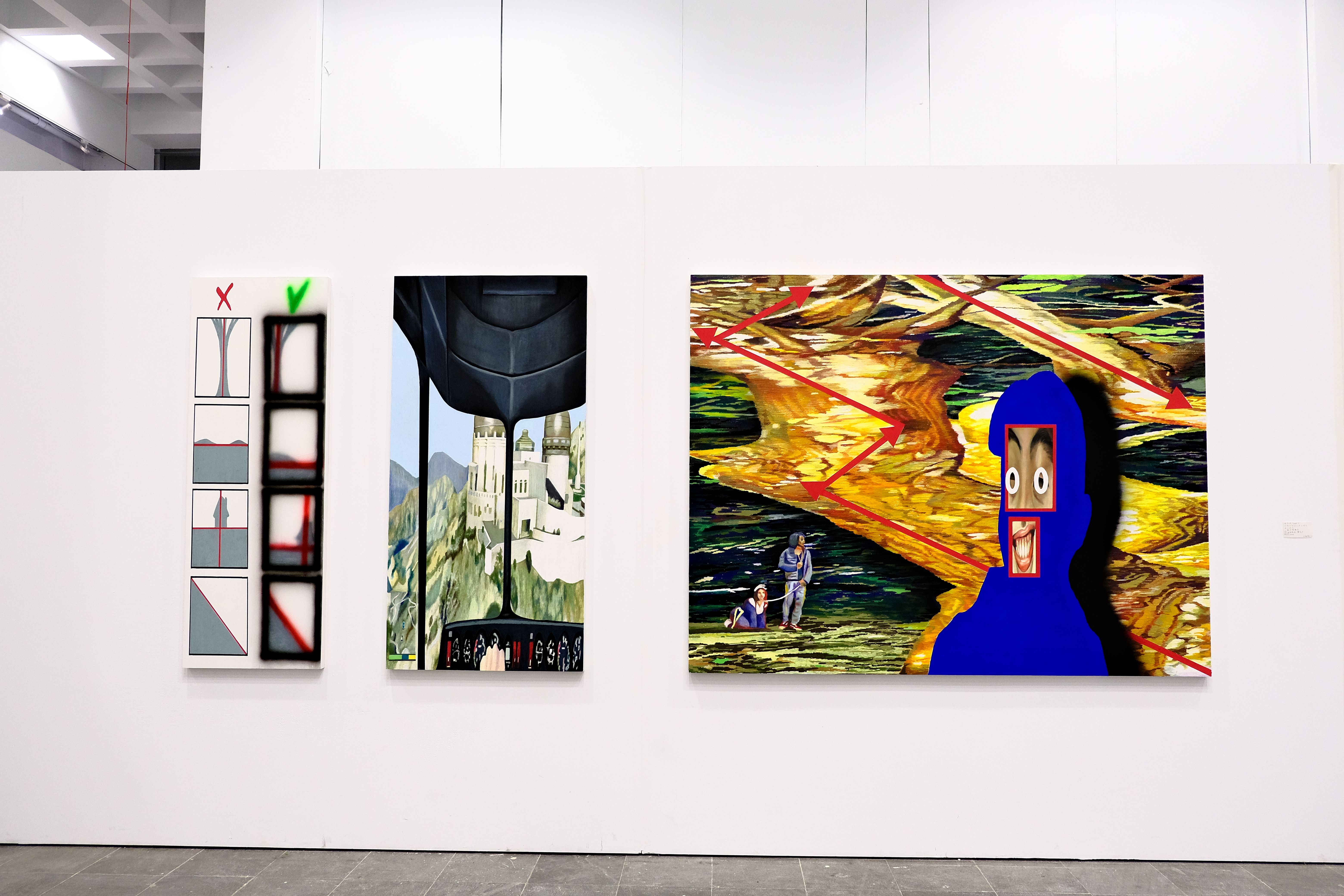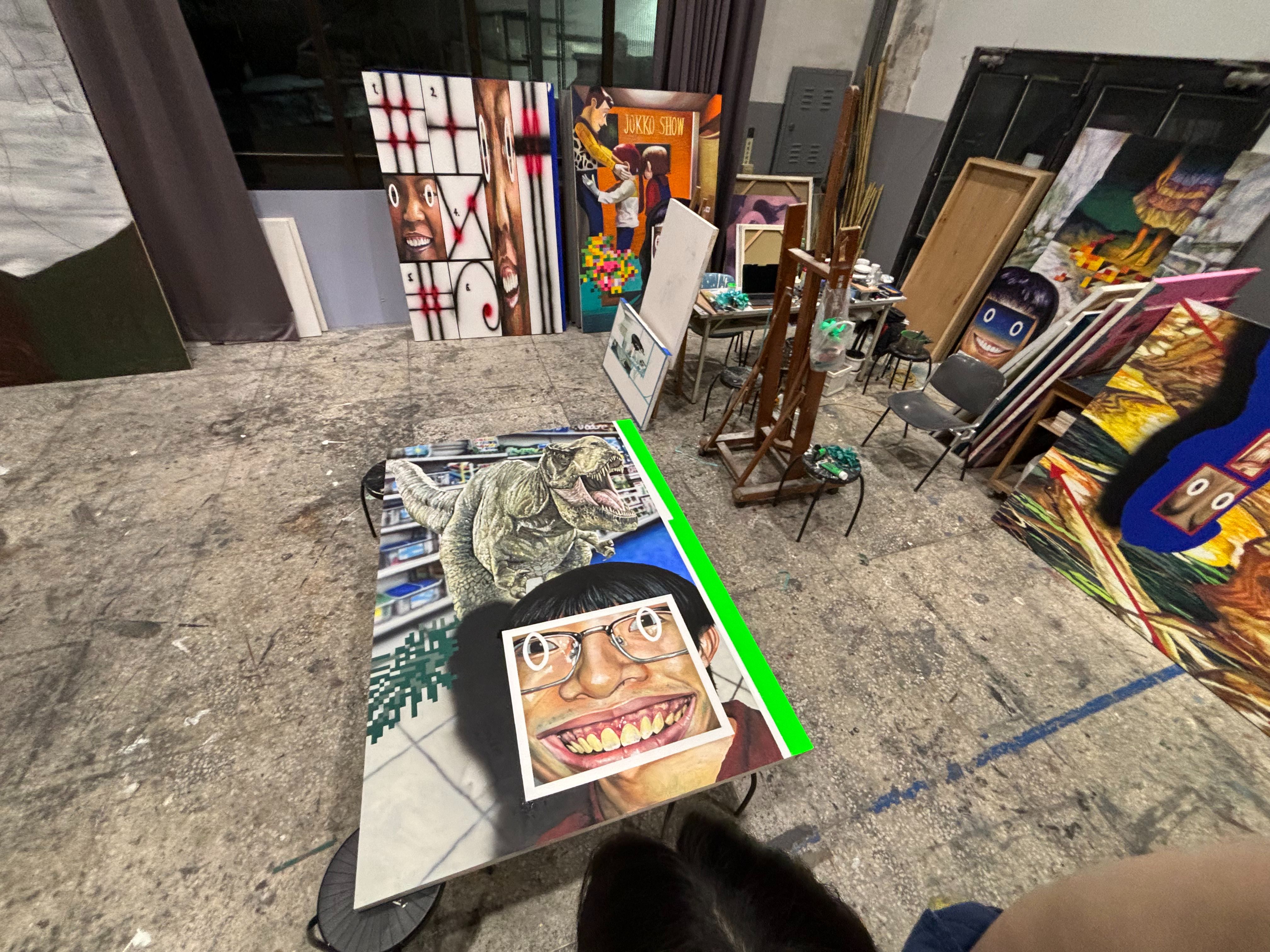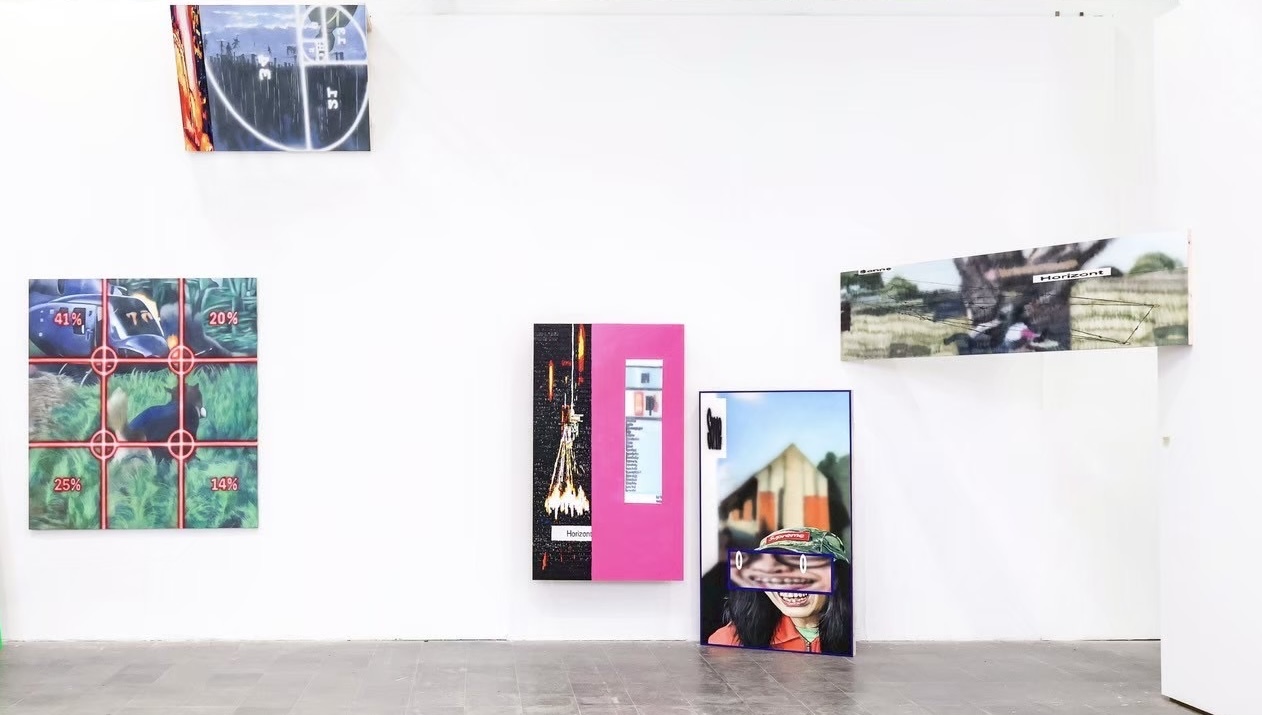 因為我不在影像的事件現場,所以當把影像融入作品時,在觀看的過程中,我其實無法馬上融入其中,因此會透過繪畫來補足當下無法接觸到的事物,例如畫面中物體移動的狀態,或是整體事件的因果關係等等。到後來,會把一些截取的畫面放大,跟繪畫做更強烈的連結,將自己在現實世界所經歷到的事件及物件,跟我作為觀者的影像做更深入的結合。因此,作品中的人物就會很像NPC角色,在影像的世界裡去彼此對話,同時也在跟觀者對話。我希望作品更像場景,而不是單一畫面,我希望它可以更「龐大」。