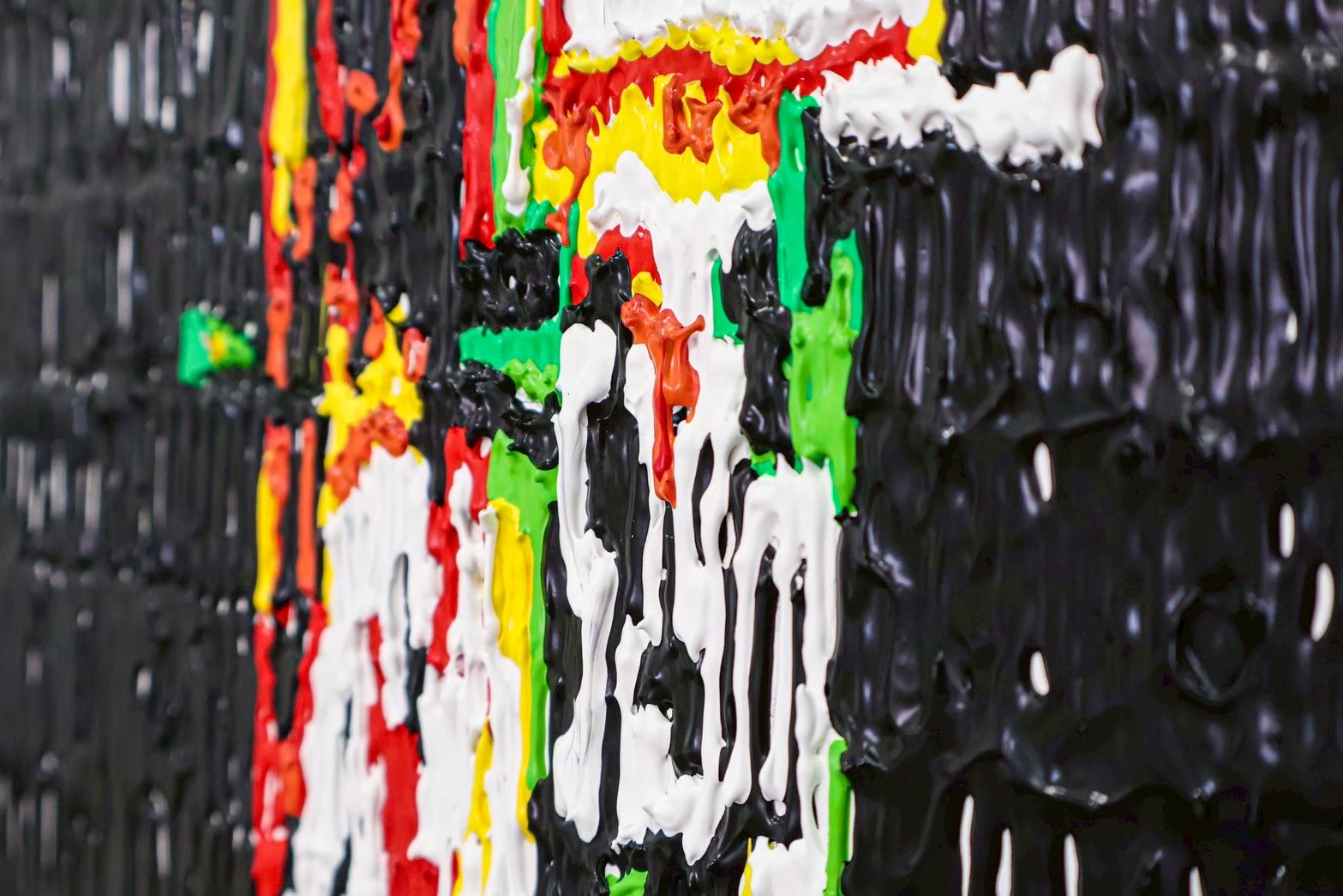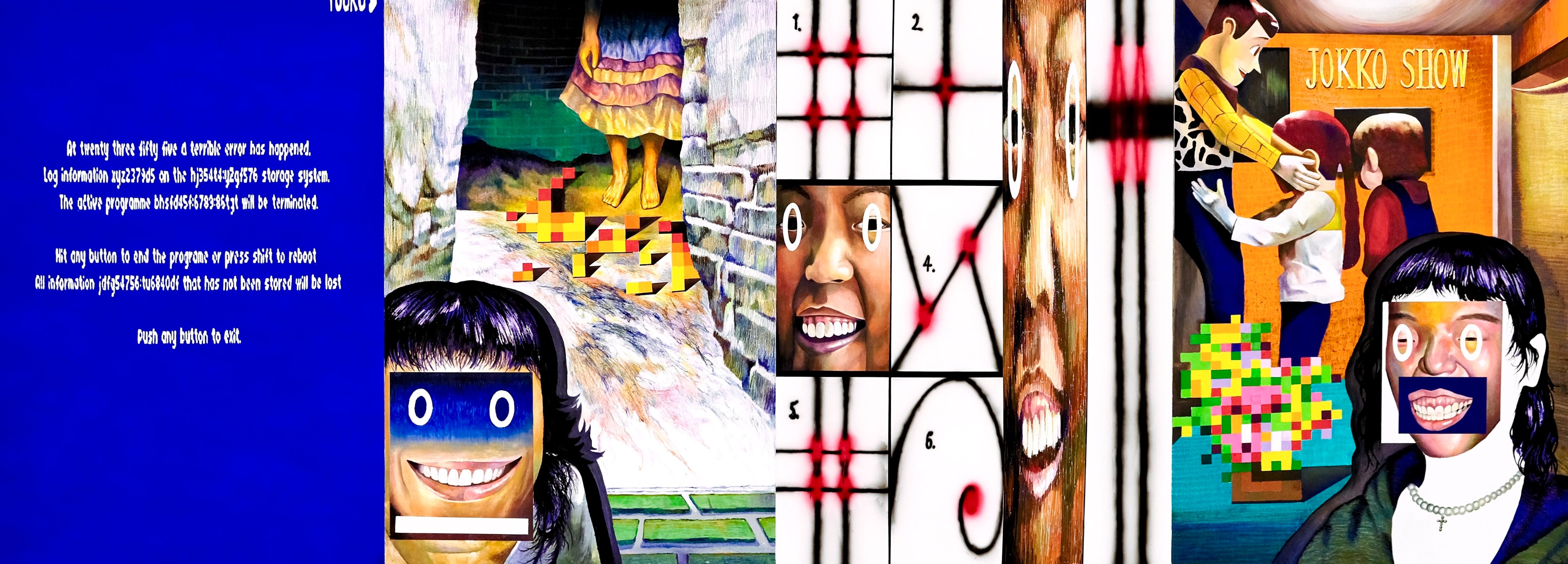 作品中使用了不同的媒材,將壓克力倒入醬料瓶中再擠出來,顏料在畫面上形成一條條微微隆起的線條,呈現出影像經過壓縮後的數位感;蠟筆則是表現了影像僵化後不太自然的樣子。大概花了兩週多一點的時間完成,非常感謝協助高重複性作業的好朋友們☺︎。