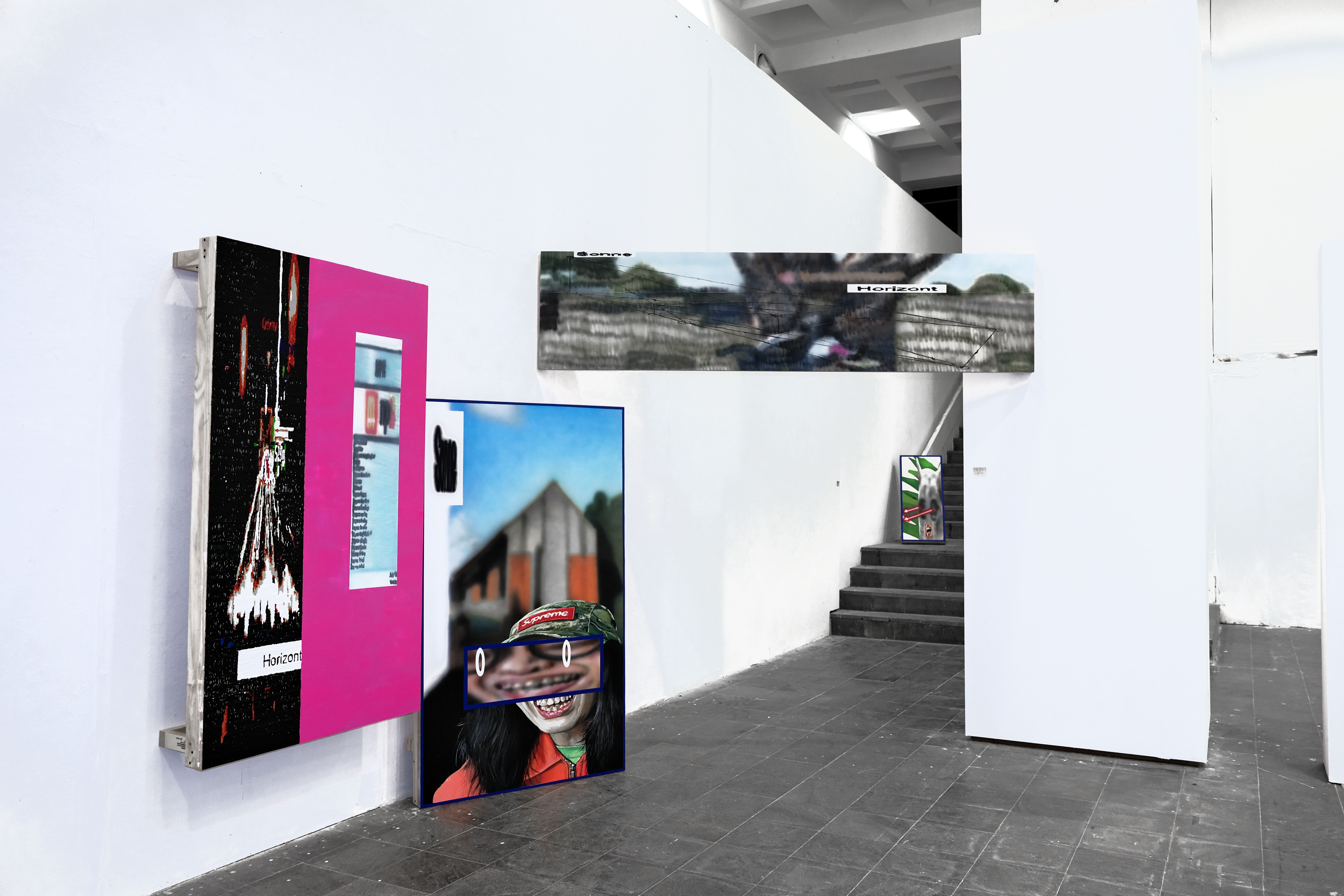 一個系列通常至少會包含三件作品,尺幅則會依照不同的情境去組合、創作。在電腦編排的階段,就會先一併思考整體的呈現方式,連同後續的佈展方式。一般來說,作品不會單純的平面上牆,展示時我通常會做一些木作搭配展示,也會想讓作品掛在奇怪的地方,像是懸浮在牆壁跟柱子中間、斜靠,或放在更高的位置(不是正常的觀看視角),比較像是場景、遊戲的懸浮視窗。目前最大的一幅作品尺寸為500公分乘以190公分,是四連作,雖然因為尺幅太大很難存放,但我認為大型作品更能把觀者帶入影像的世界中,也能帶來更直接、震撼的感受,但也可能我只是想要挑戰更大件的作品(笑)。