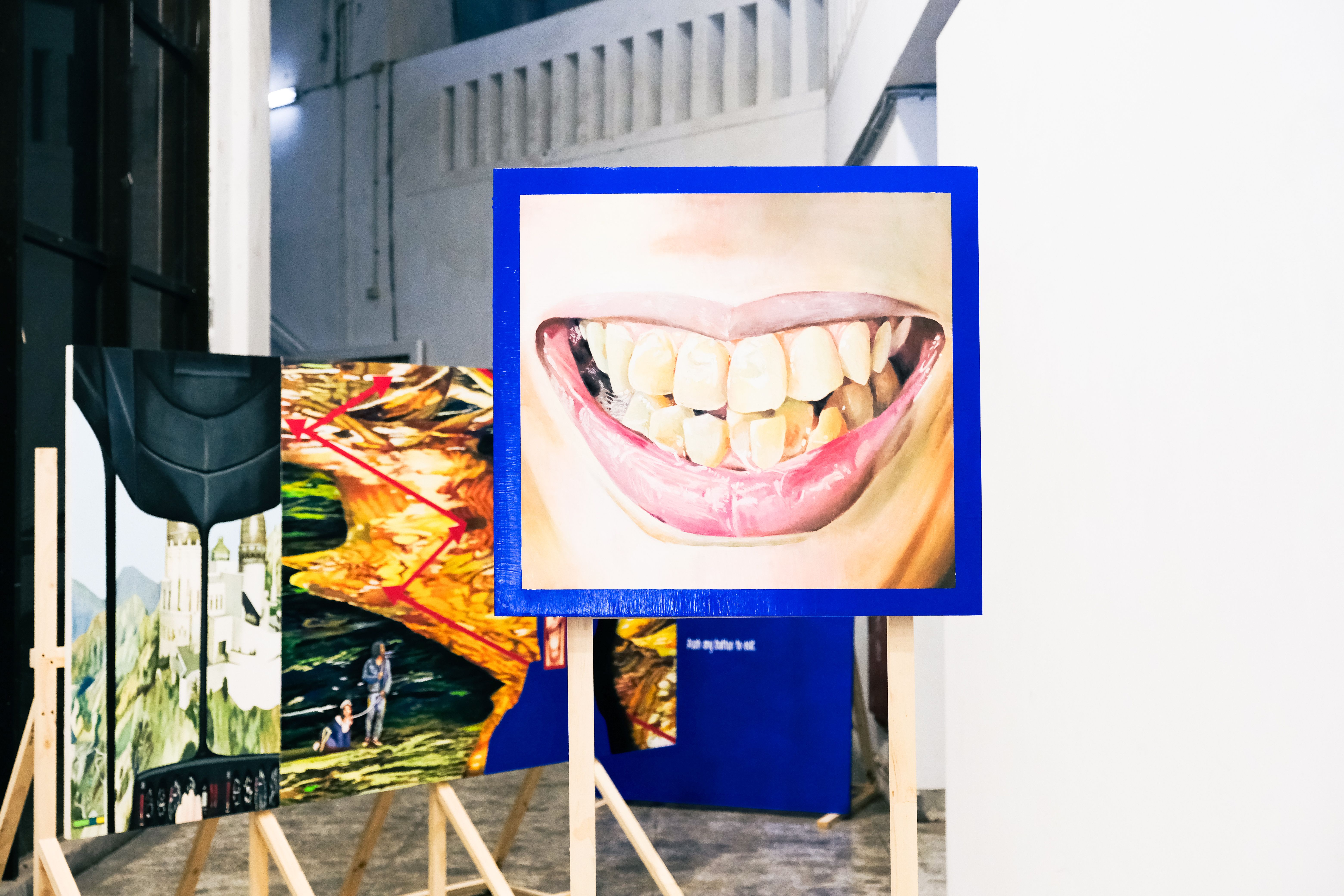 大學時有嘗試創作過一些裝置、行為、雕塑,但在繪畫上好像更得心應手,繪畫可以讓我隨心去使用、做出更多快速且直覺性的的判斷,能呈現自己的美學,或是規避掉限制自己的美學,也可以讓人在當下判斷出媒材的好壞。近幾年的作品相較理性一點,主要是因為素材來自於影像,不像以前會有隨筆,就比較不是我個人情感直接的表達或生活經驗的敘述。我有個名為「素材」的資料夾,裡面會分為歷史事件、社會事件、種族議題等等,也有些是很單純不知為何存在的好笑內容。